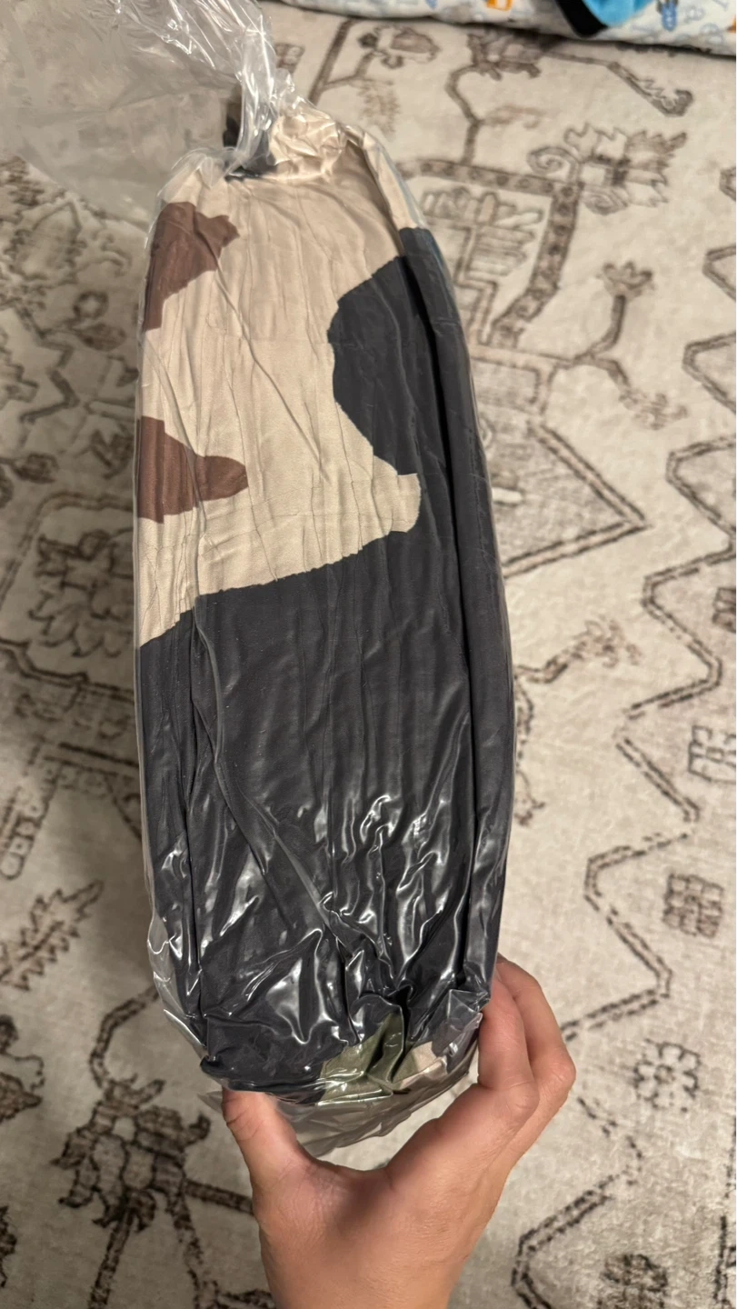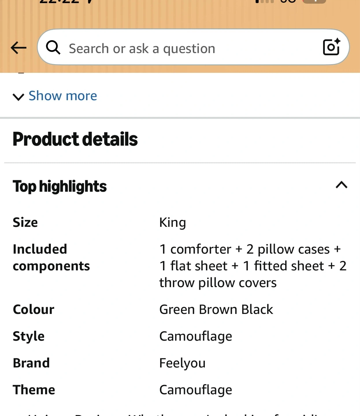 Bedding set comes in a king size with a camouflage pattern. It includes a comforter, two pillow cases, one flat sheet, one fitted sheet, and two throw pillow covers. The colours are green, brown, and black.