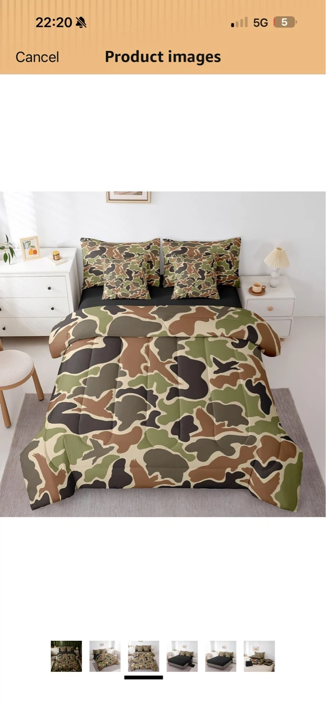 Bedding set comes in a king size with a camouflage pattern. It includes a comforter, two pillow cases, one flat sheet, one fitted sheet, and two throw pillow covers. The colours are green, brown, and black.