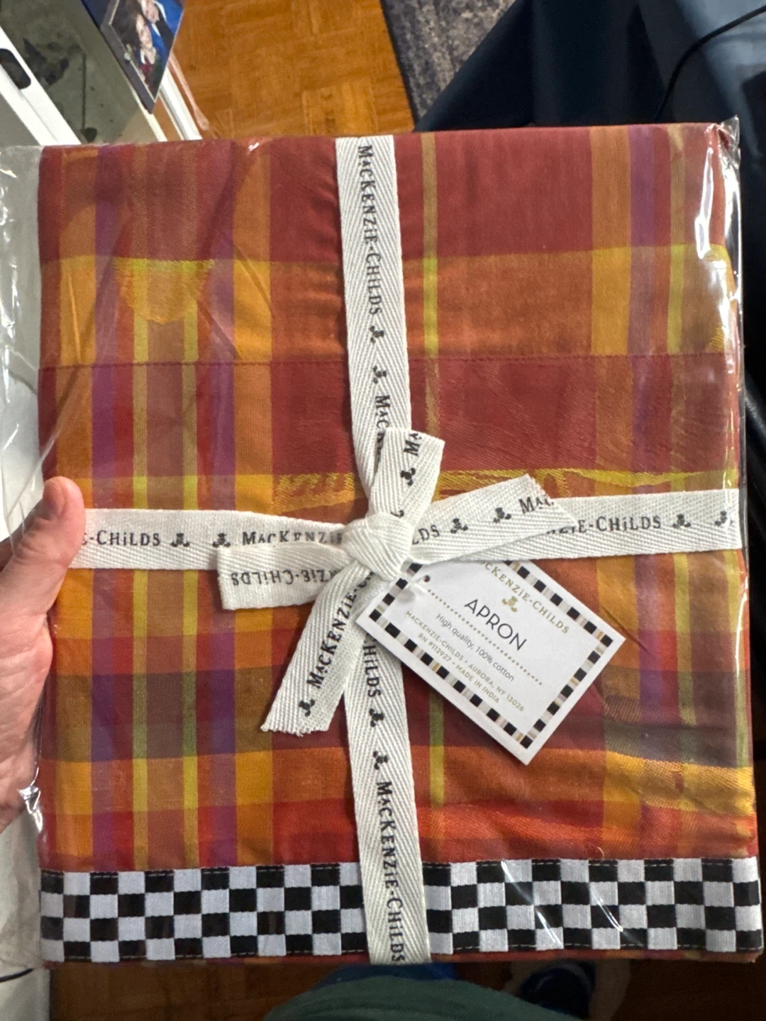 I'm selling a brand new Mackenzie-Childs Falling Leaves Apron! It's still in its original packaging. The apron is made of high-quality 100% cotton and features a beautiful plaid pattern in warm autumn colors. The SKU is 70107-054. Made in India