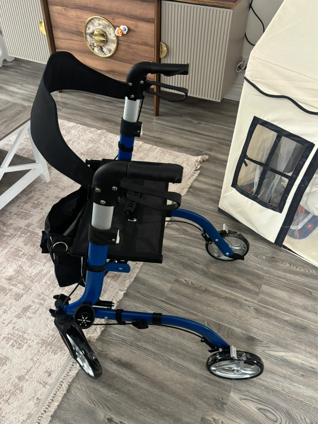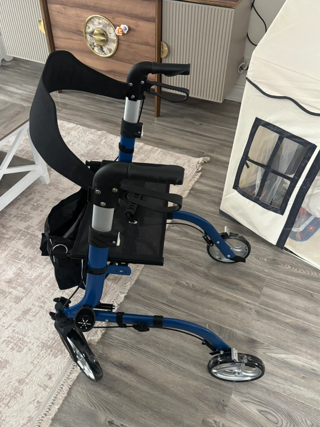 Blue 4-Wheel Walker with Seat and Bag
