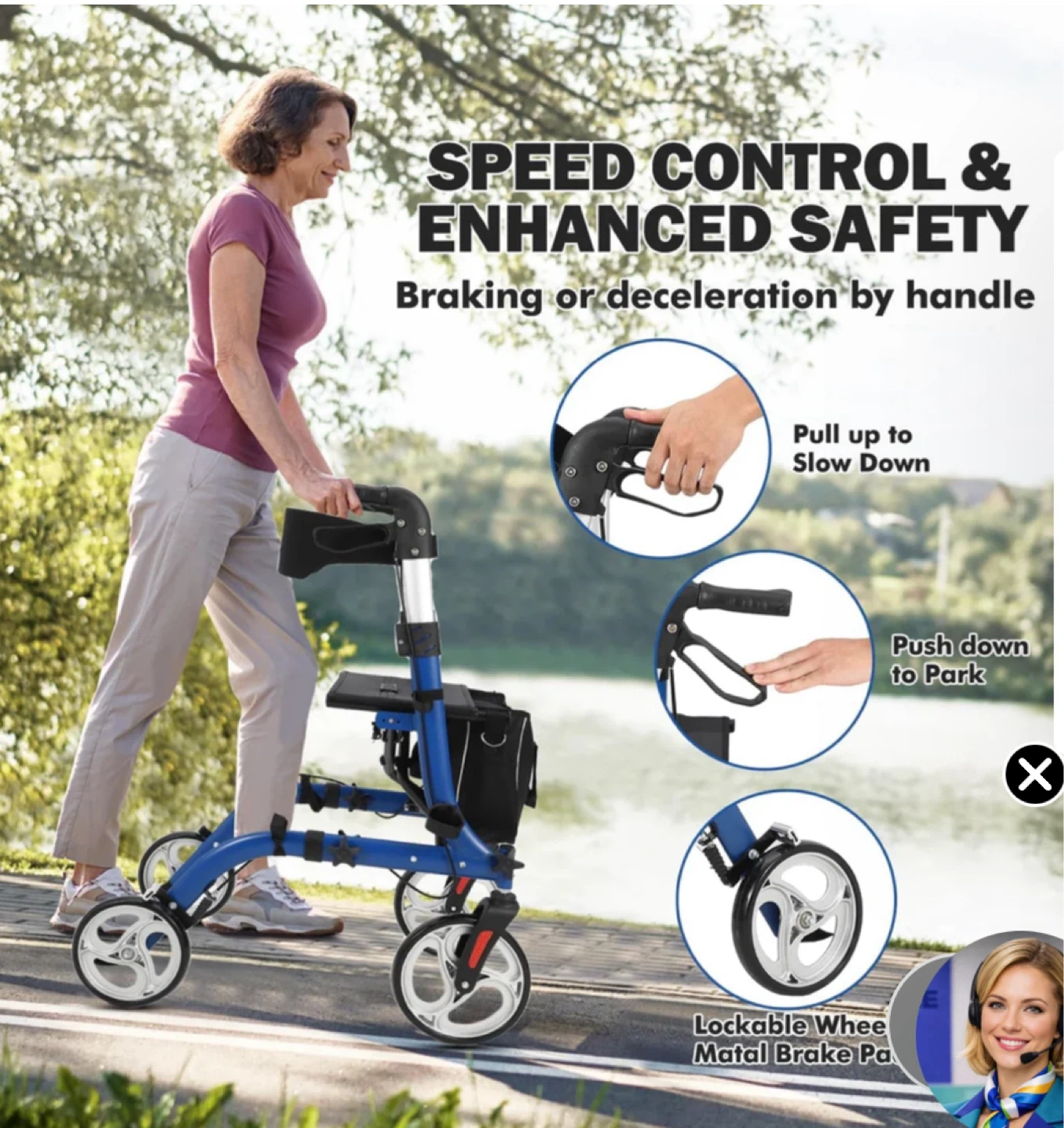 This four-wheel walker features a built-in seat and a convenient storage bag. It offers speed control with braking and deceleration by handle. The wheels are lockable for enhanced safety. It's designed for leisure time and outgoing activities.