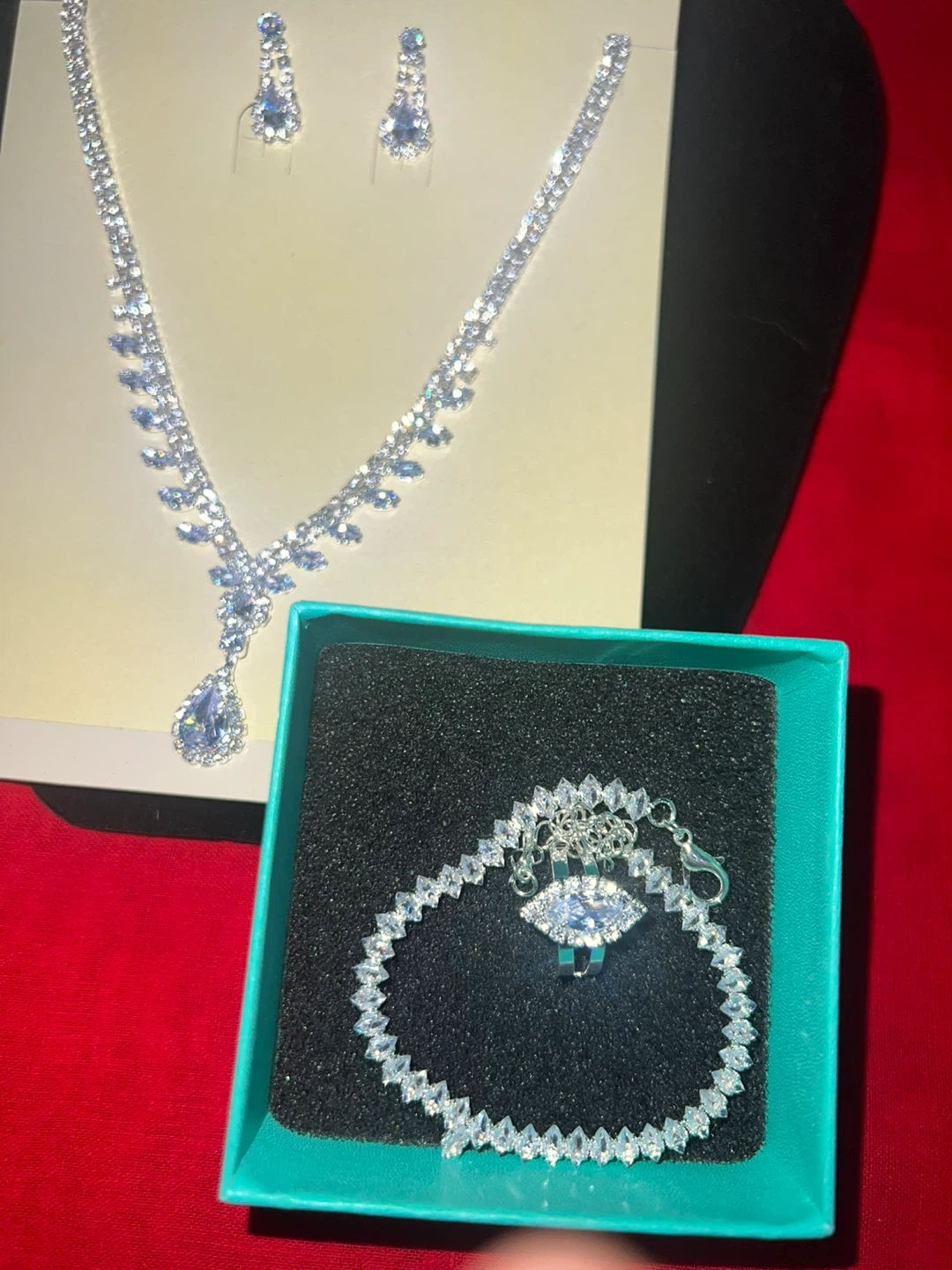 Selling a beautiful jewellery set that includes a necklace, bracelet, ring, and earrings. Perfect for a special occasion or to add a touch of sparkle to any outfit!