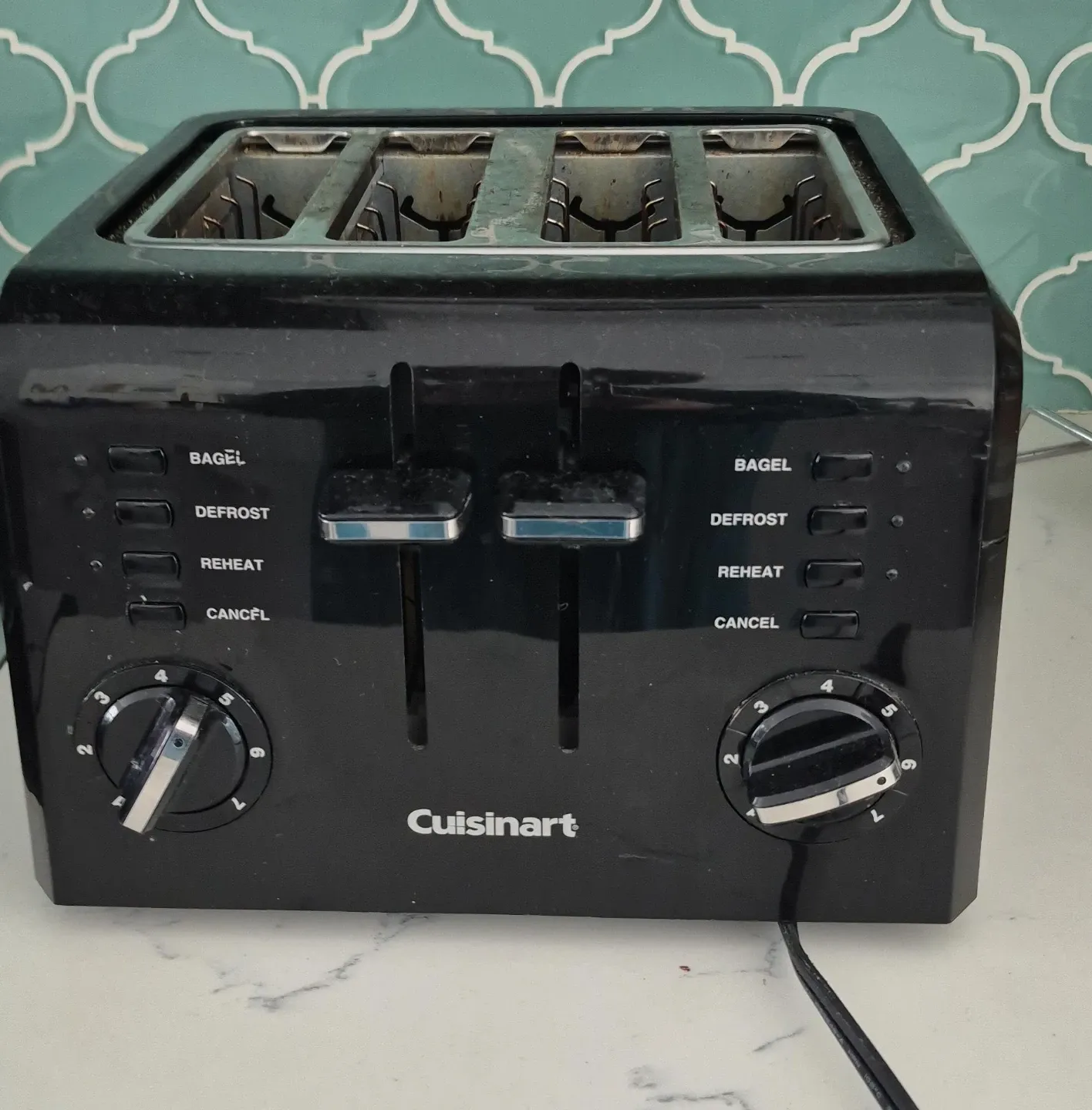 This is a black Cuisinart 4-slice toaster. It has settings for bagel, defrost, and reheat. Toasting levels are adjustable from 1 to 7.