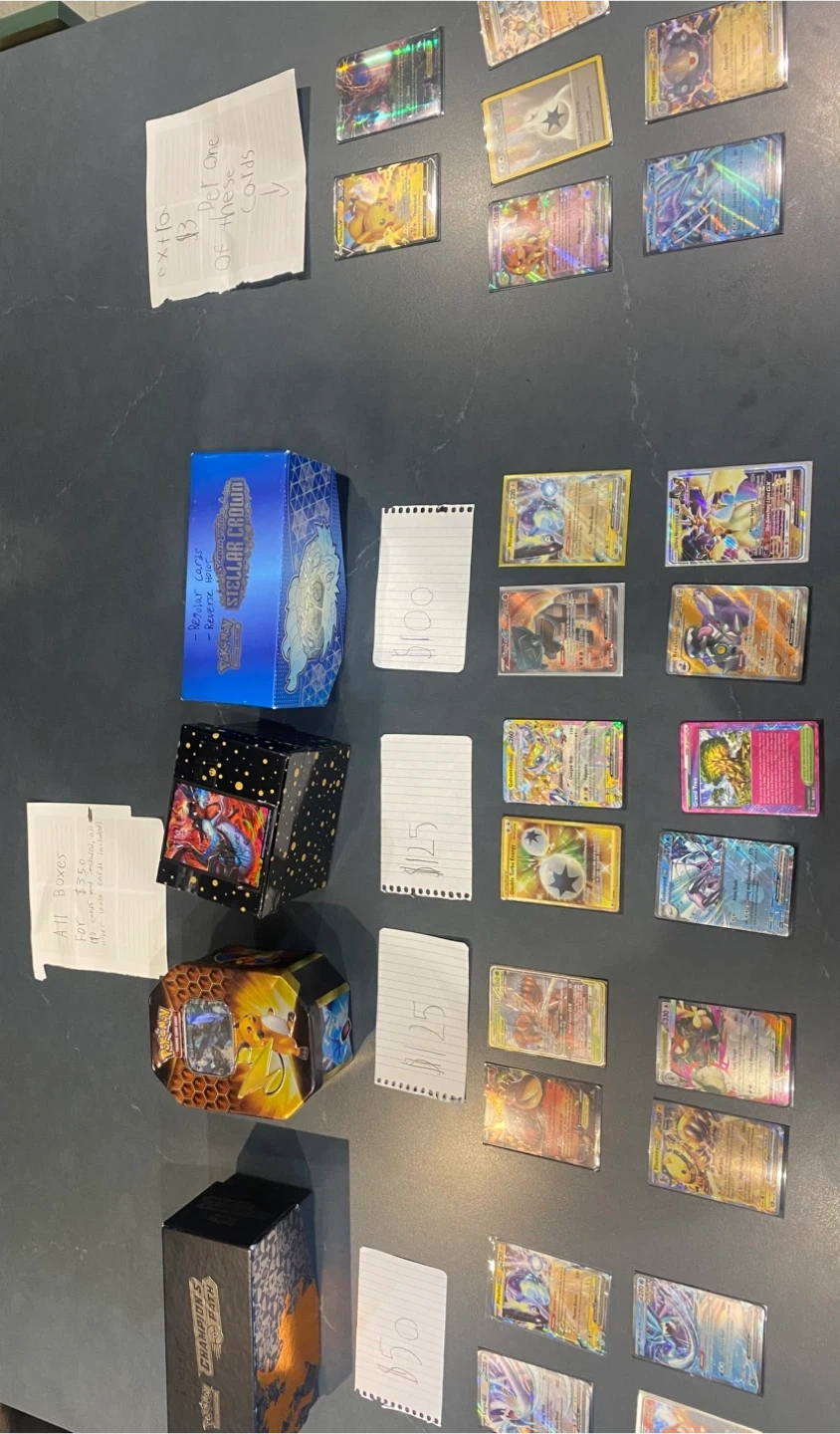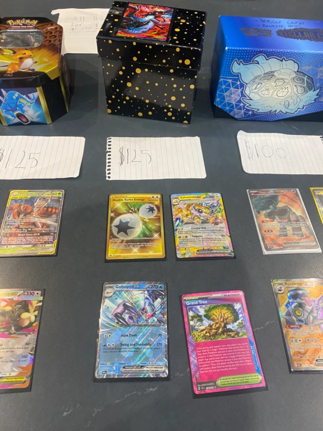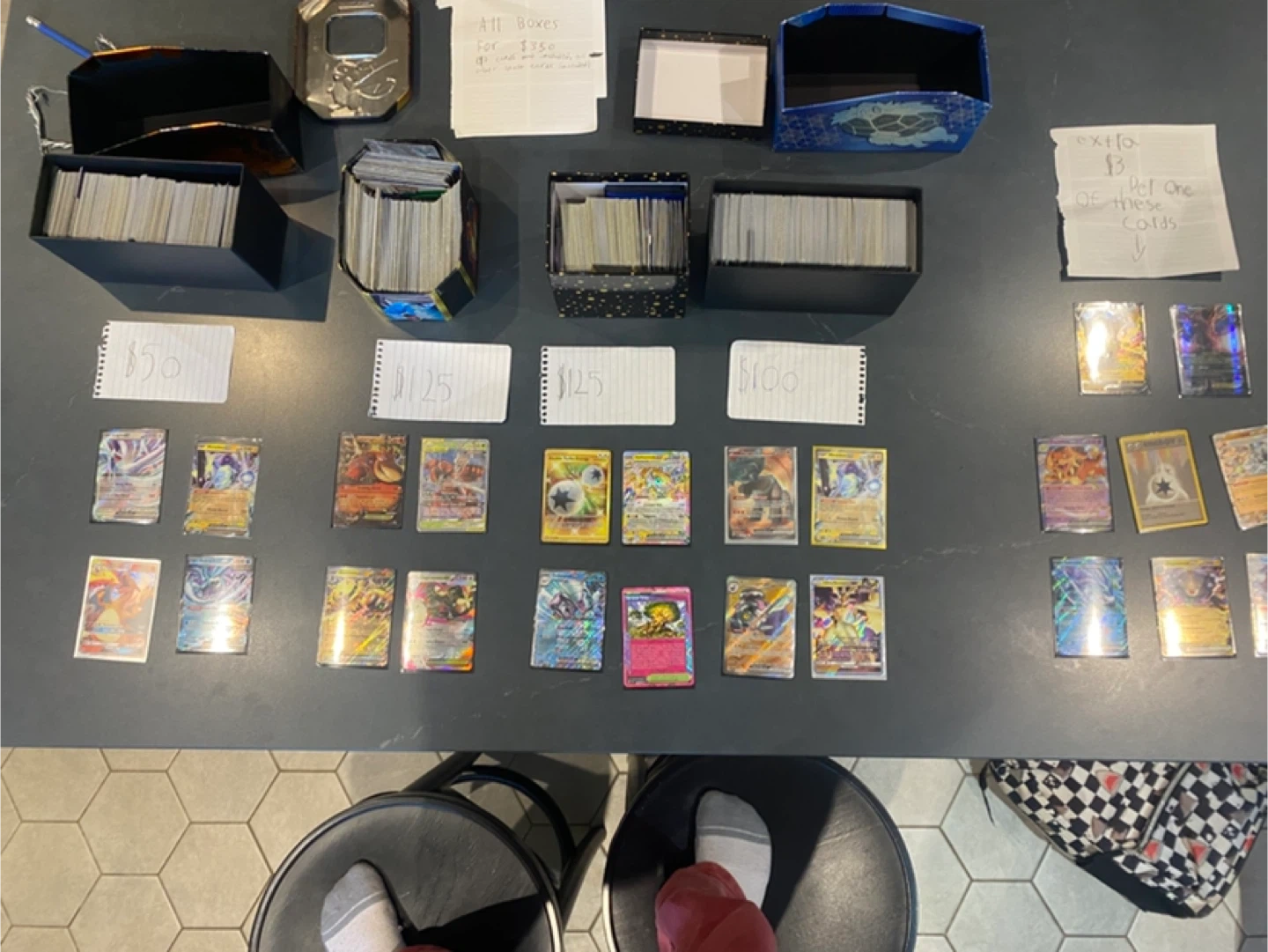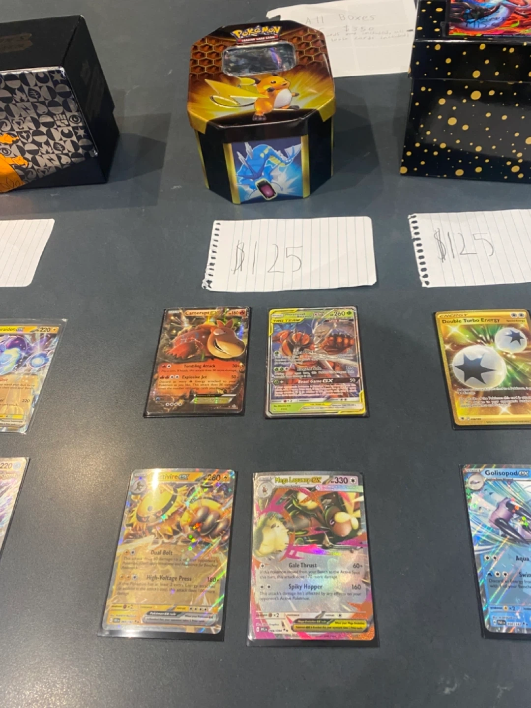A very large collection of various bulk Pokémon cards. All cards are sorted by what type of card they are (holo, reverse holo, energy, trainer, regular). Prices range from 50 dollars a box to 125 dollars a box. If you would like to purchase all of the boxes the total will be $350. There are cards on the side that are $3 per card and are not included with buying anything else. The cards included in the other images under the boxes are only given if you buy all of the boxes or the box it is under. If you would like, you could also purchase just the 3 dollar cards by the selves. CASH ONLY!