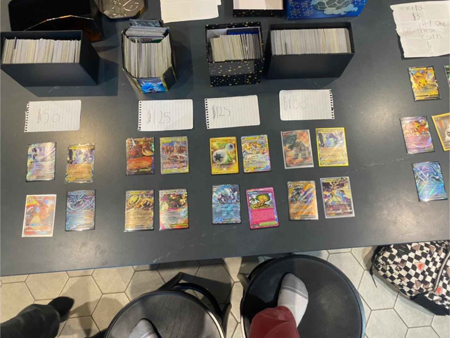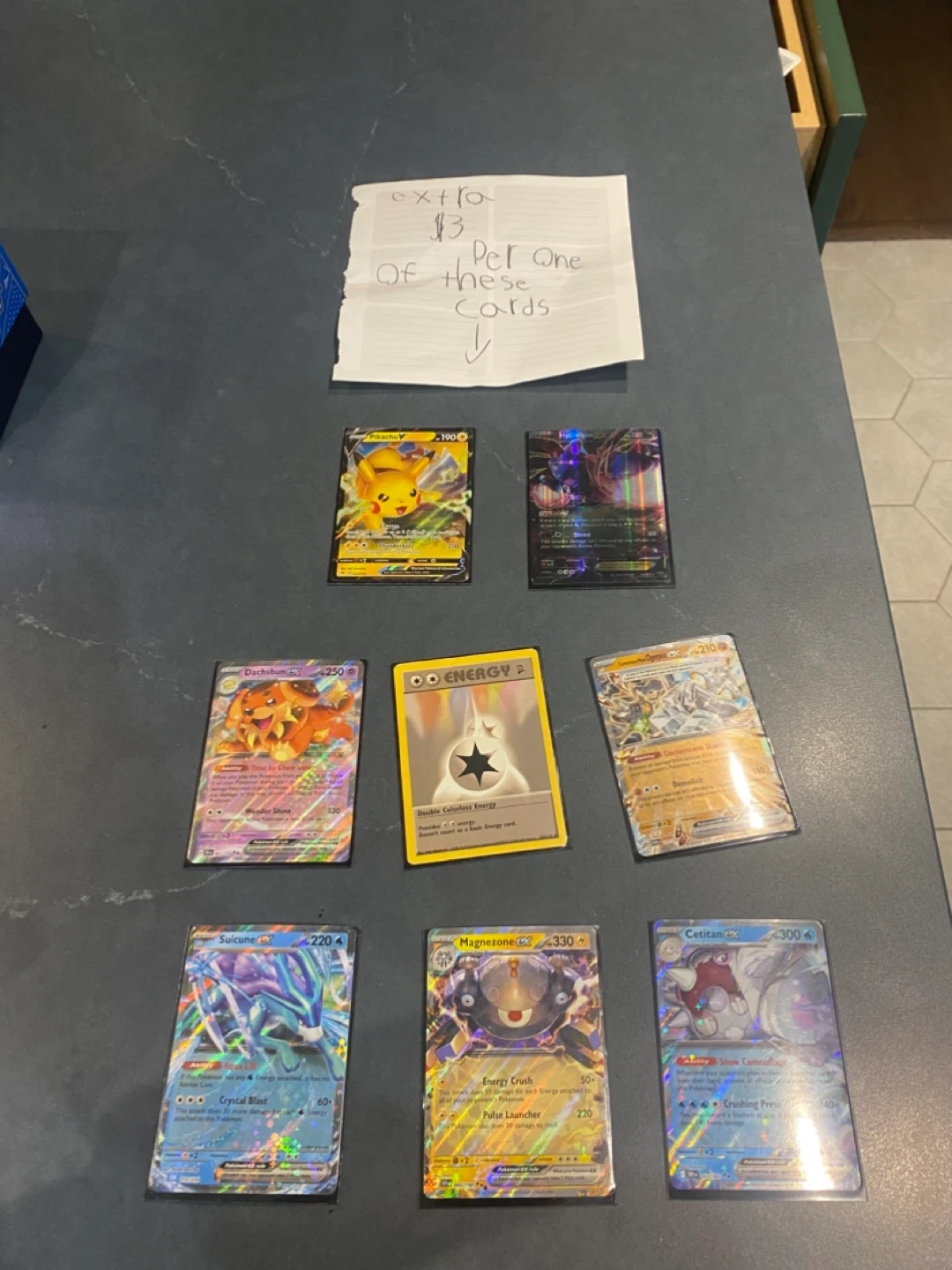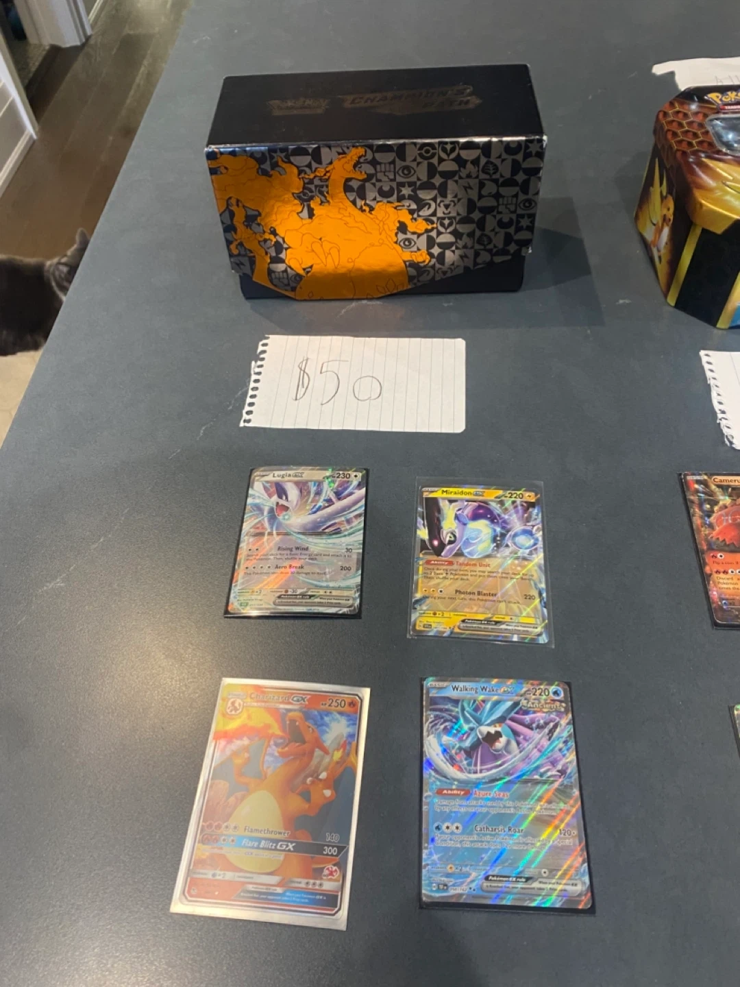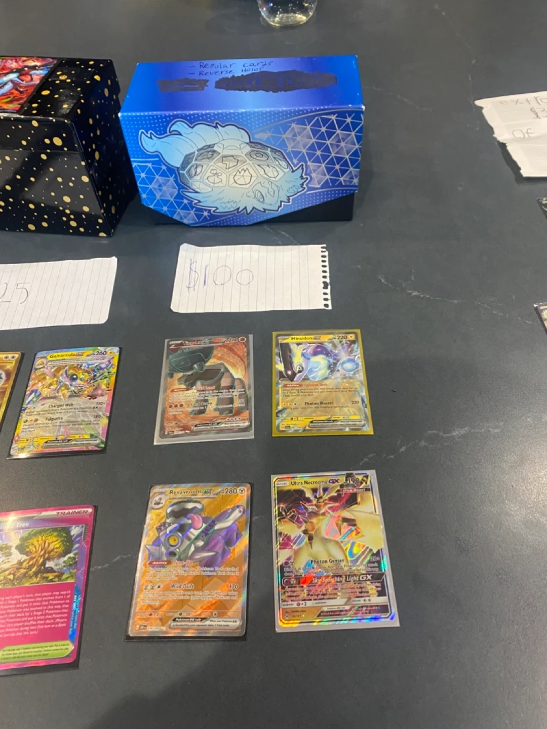 A very large collection of various bulk Pokémon cards. All cards are sorted by what type of card they are (holo, reverse holo, energy, trainer, regular). Prices range from 50 dollars a box to 125 dollars a box. If you would like to purchase all of the boxes the total will be $350. There are cards on the side that are $3 per card and are not included with buying anything else. The cards included in the other images under the boxes are only given if you buy all of the boxes or the box it is under. If you would like, you could also purchase just the 3 dollar cards by the selves. CASH ONLY!