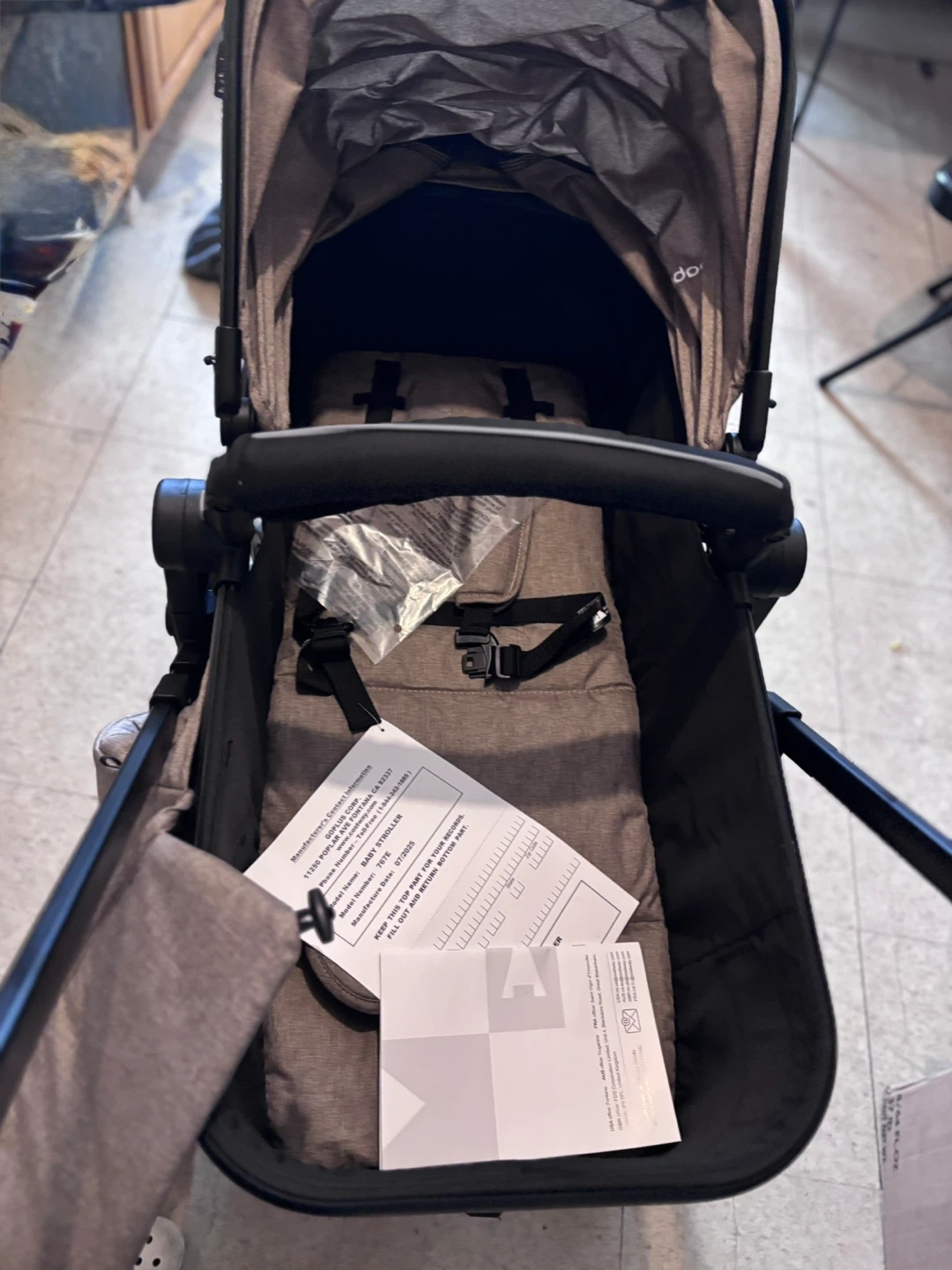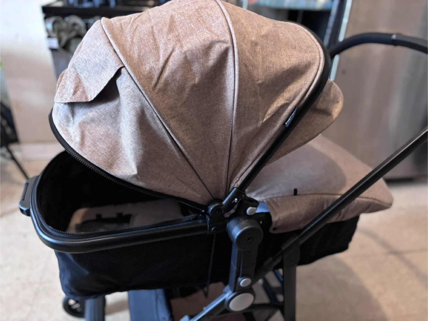 This Doona is an all-in-one infant car seat and stroller. It's designed for easy transitions from car to street. The color is a neutral beige/taupe.