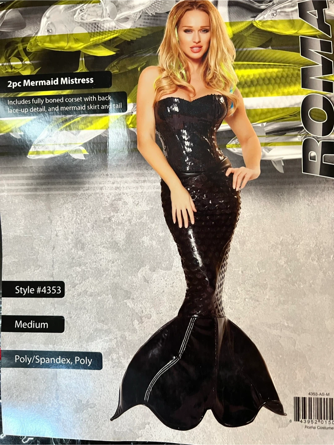 This is a 2-piece Mermaid Mistress costume. It includes a fully boned corset with back lace-up detail, and a mermaid skirt and tail. Made from Poly/Spandex and Poly materials. Perfect for costume parties!