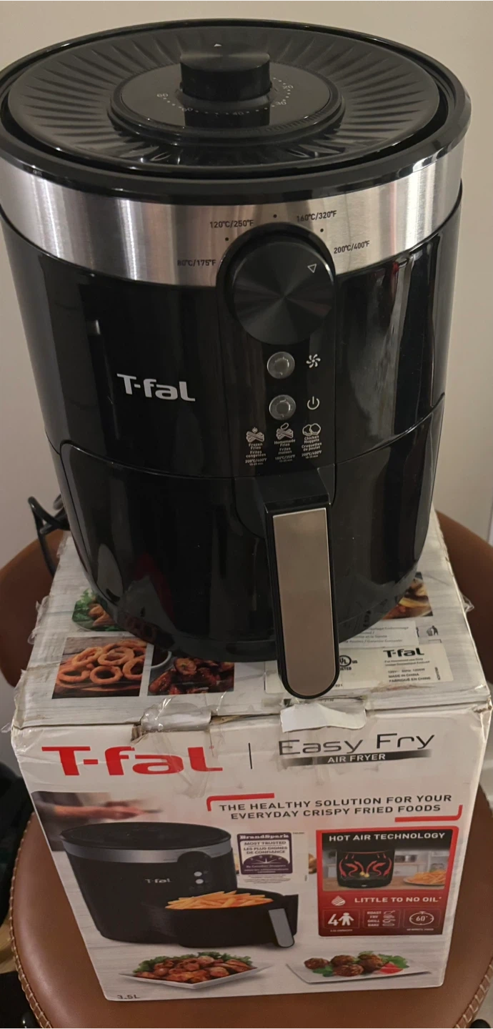 This is a T-fal Easy Fry Air Fryer with hot air technology. It has a 3.5L capacity and is designed for making crispy fried foods with little to no oil. Multiple cooking presets are available, including for frozen fries and chicken nuggets.any food recipes