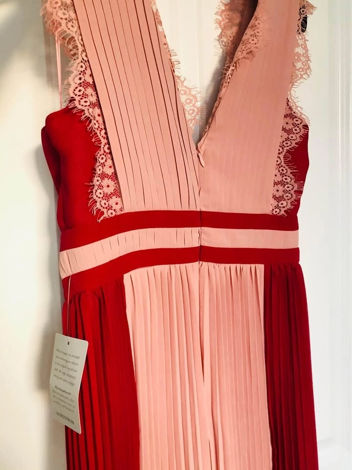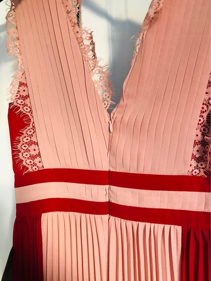 Brand new with tag. Bought from Nordstrom for $92.98 + tax. Size S. Sleeveless, perfectly pleated dress with bright color blocking and lace detailing, to look chic, elegant and super trendy, day or night! Features a V-neckline with lace detail, back zipper, and is floor length. Dry clean only.