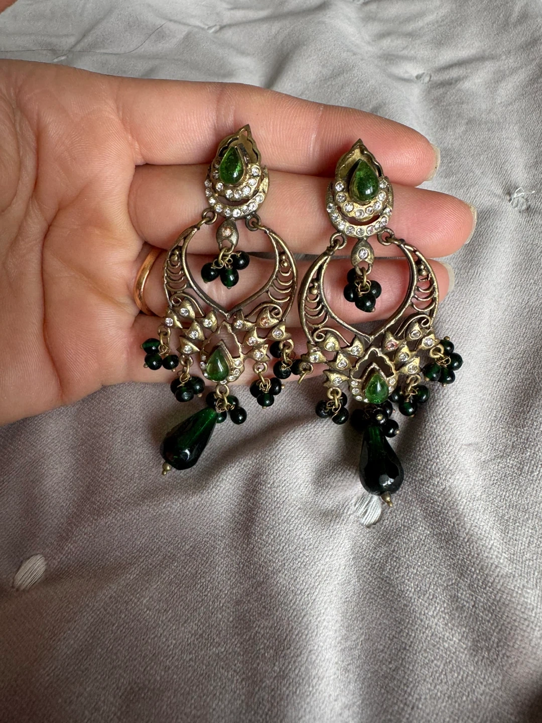 Elegant chandelier-style earrings featuring intricate gold-tone metalwork. They're adorned with clear crystals and deep green beads, including teardrop-shaped accents. These earrings add a touch of glamour to any outfit!