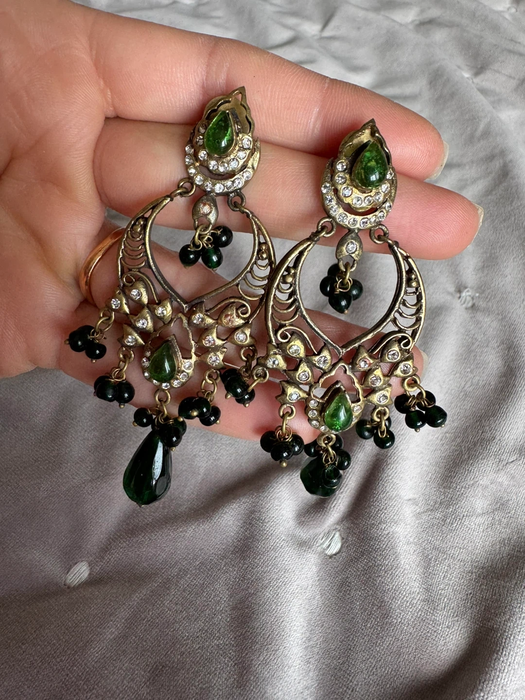 Elegant chandelier-style earrings featuring intricate gold-tone metalwork. They're adorned with clear crystals and deep green beads, including teardrop-shaped accents. These earrings add a touch of glamour to any outfit!