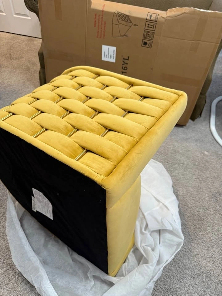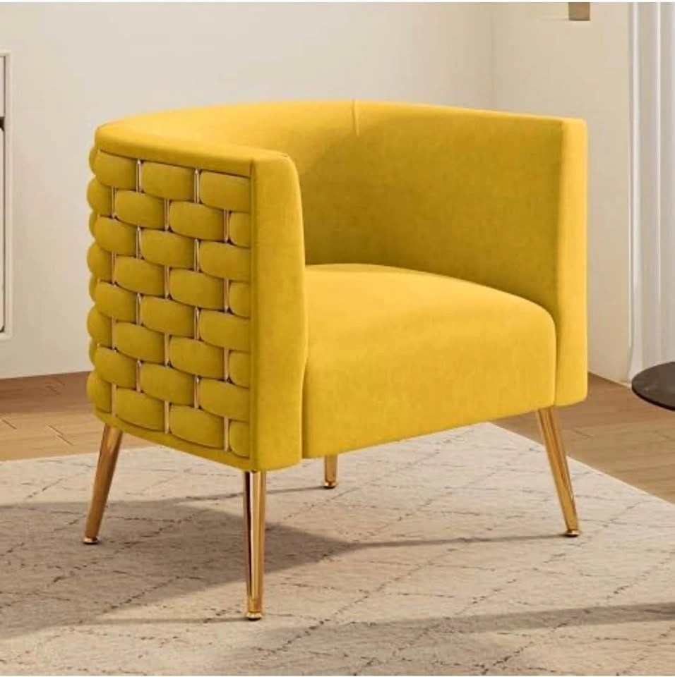 This modern accent barrel chair features a unique handmade woven design on the back and side armrests, adding elegance to your home. It's perfect for various rooms like the living room, bedroom, or home office. The spacious seating area is filled with high-resilient sponge for comfort, and the wrap-around backrest and armrests offer support. The chair has an engineered wood and metal frame, with thick metal legs supporting up to 300 pounds. Golden legs with footpads protect your floor. The soft, tufted velvet fabric is skin-friendly, scratch-resistant, breathable, and easy to clean. The curved backrest is ergonomically designed for lumbar, back, and arm support. Simple assembly with included tools.