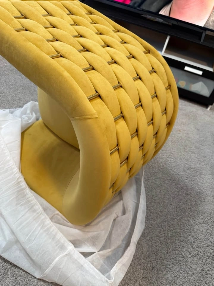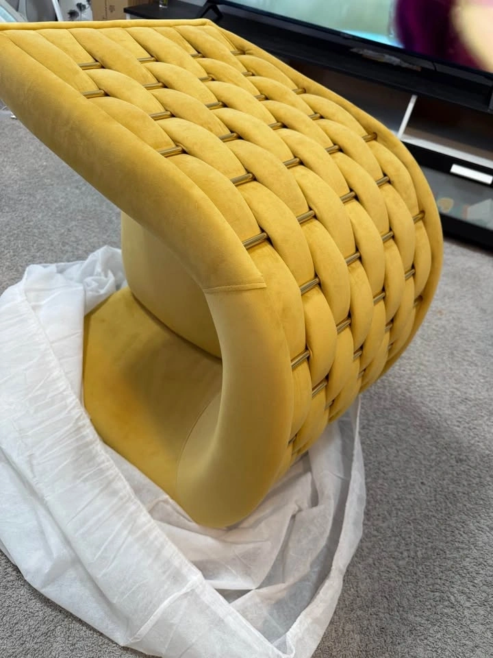 This modern accent barrel chair features a unique handmade woven design on the back and side armrests, adding elegance to your home. It's perfect for various rooms like the living room, bedroom, or home office. The spacious seating area is filled with high-resilient sponge for comfort, and the wrap-around backrest and armrests offer support. The chair has an engineered wood and metal frame, with thick metal legs supporting up to 300 pounds. Golden legs with footpads protect your floor. The soft, tufted velvet fabric is skin-friendly, scratch-resistant, breathable, and easy to clean. The curved backrest is ergonomically designed for lumbar, back, and arm support. Simple assembly with included tools.