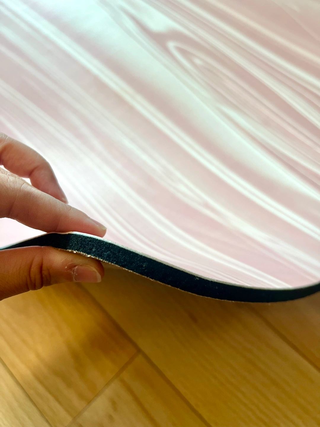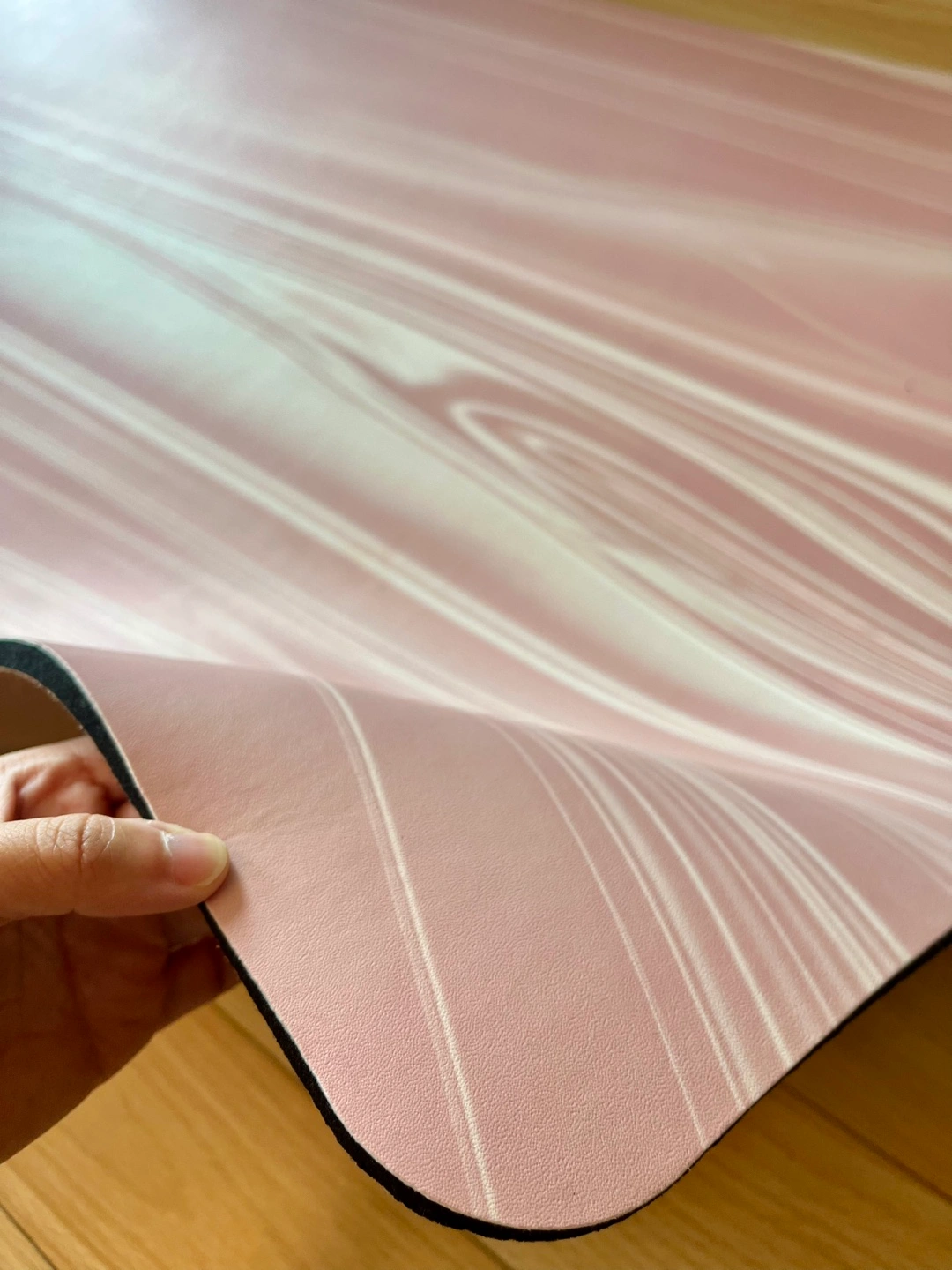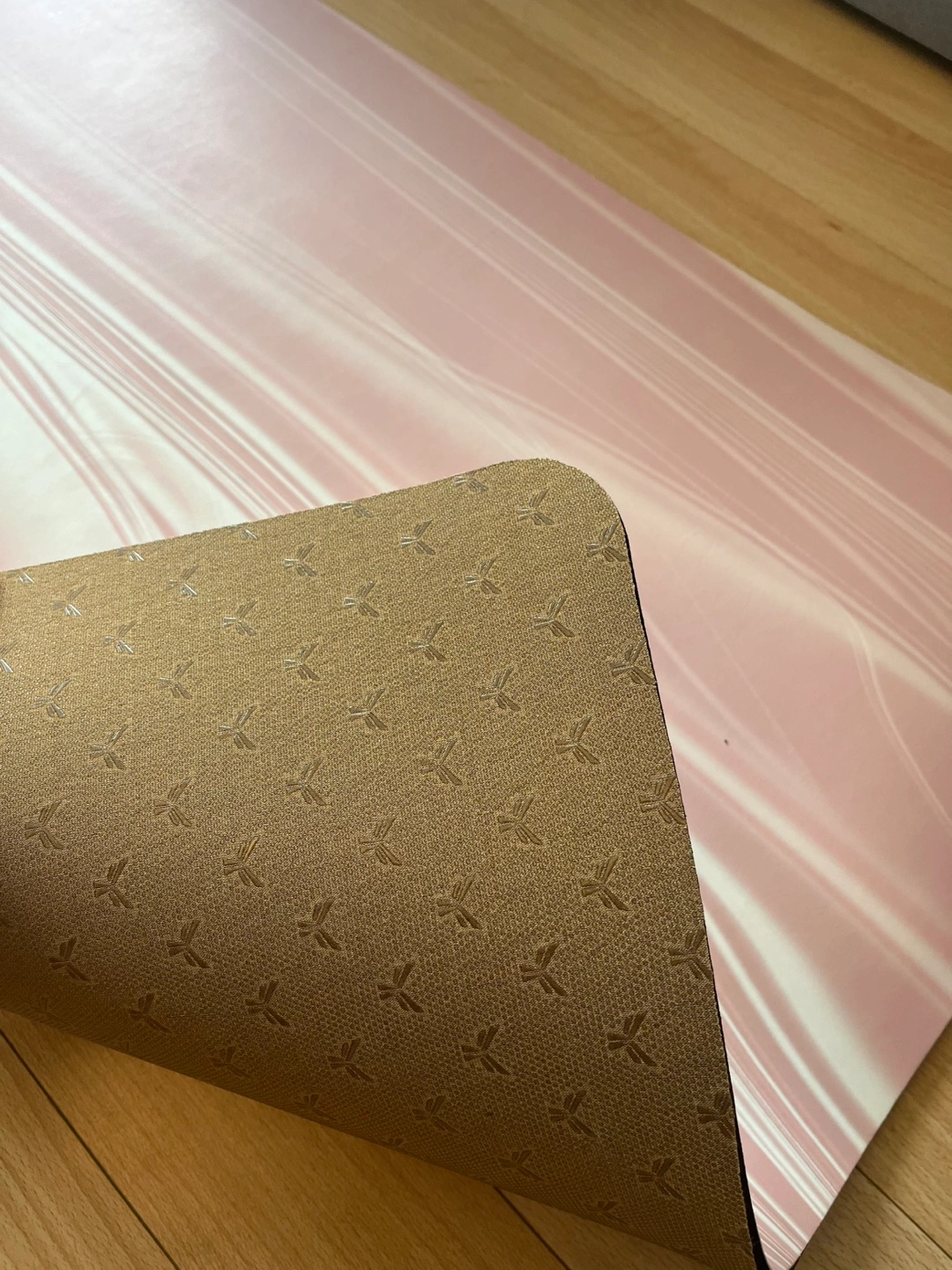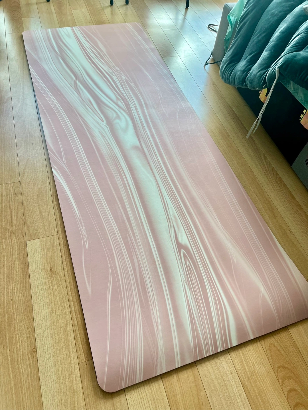 110Selling a yoga mat with a unique pink marble design. The material is soft and comfortable, perfect for your yoga or workout routines. The bottom has a non-slip texture to keep you steady during poses. It's in great condition and ready for a new home!