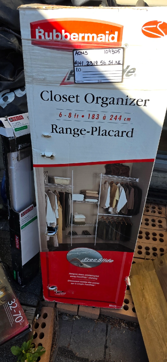 Rubbermaid Closet Organizer, with a range of 6-8 ft (183 to 244 cm). The box shows it's a Range-Placard model with a Free Slide feature for uninterrupted hanger movement. Never used!
