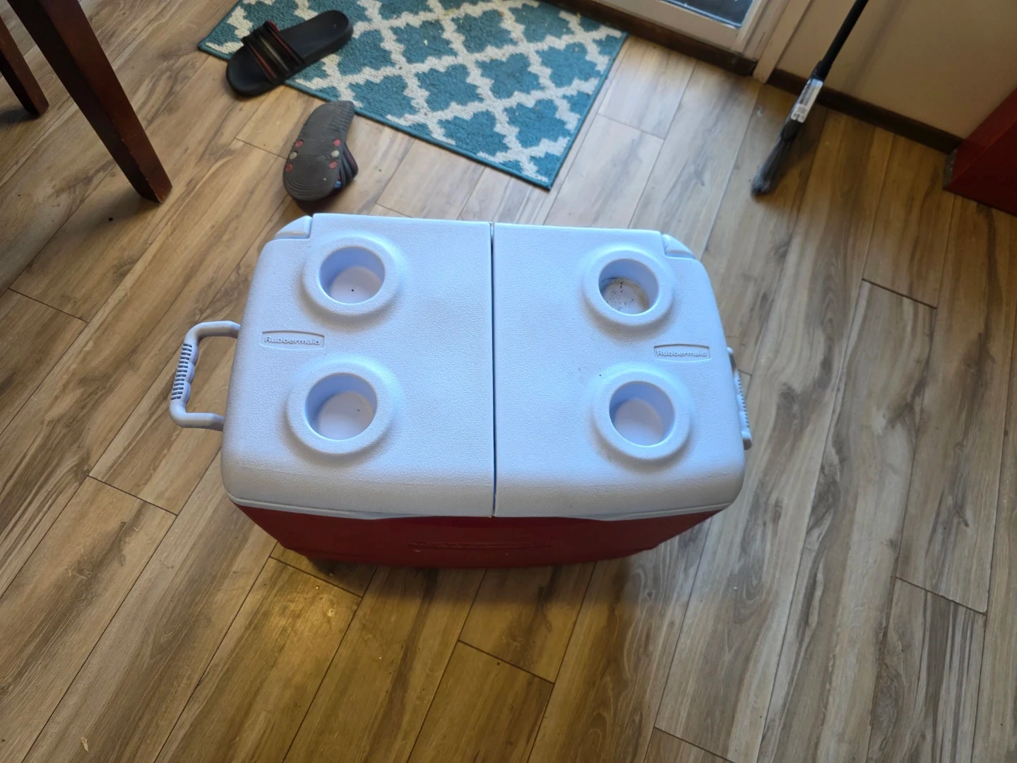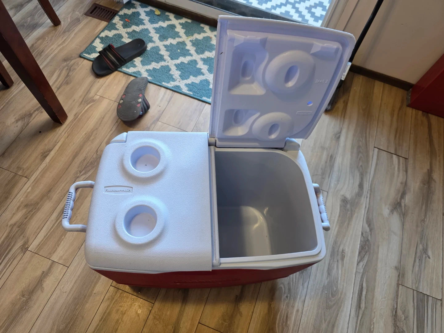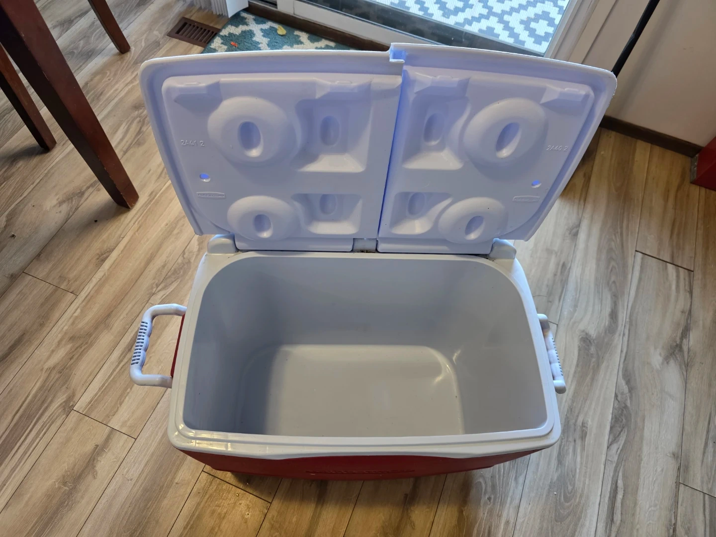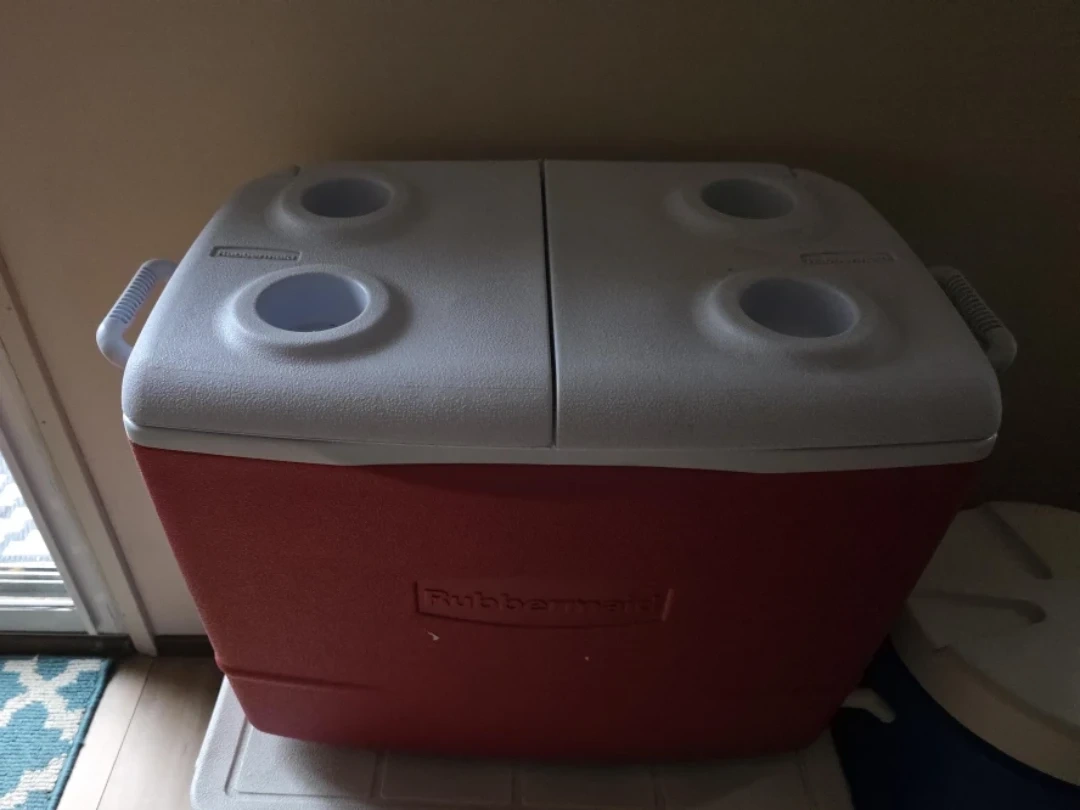 87Selling a gently used Rubbermaid cooler! It's in great shape and ready to keep your drinks and snacks cold for your next picnic or camping trip. The cooler features a red base with a white lid, complete with convenient cup holders on top. Perfect for summer!