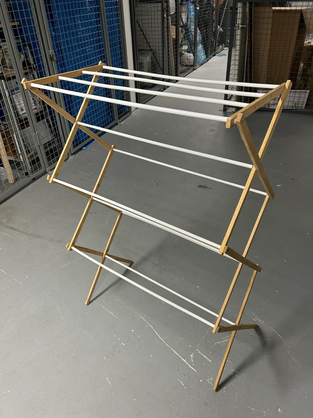 A foldable wooden drying rack with white bars. It's useful for air-drying laundry. Folds flat for easy storage.