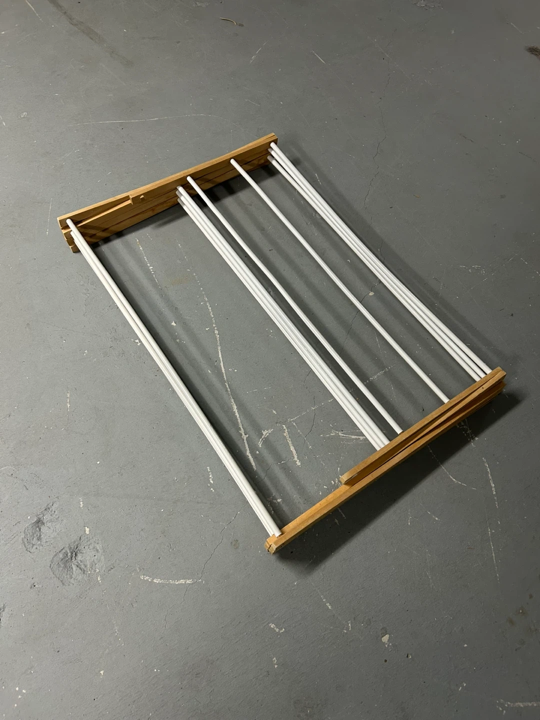 A foldable wooden drying rack with white bars. It's useful for air-drying laundry. Folds flat for easy storage.
