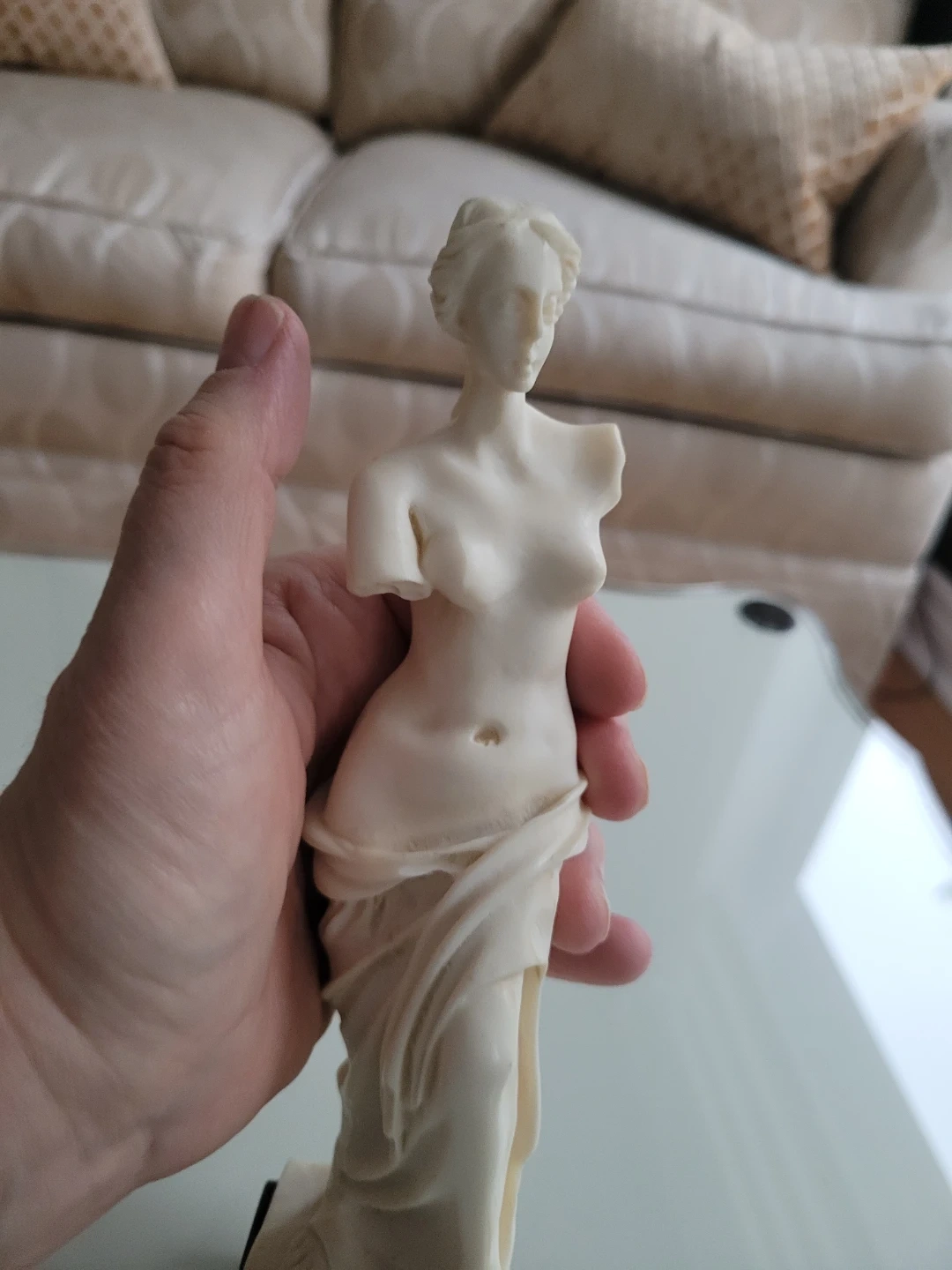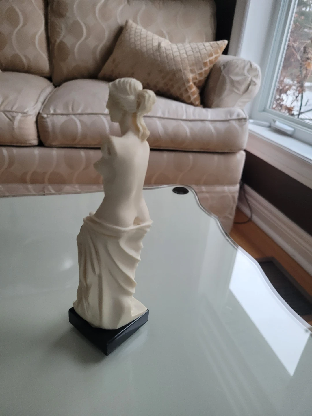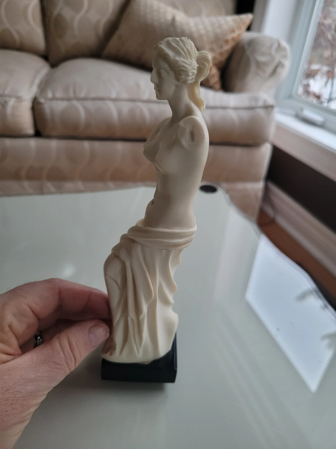 This is a decorative figurine of the Venus de Milo. Made from a cream-coloured resin. A classical piece for display. H: 8.5"