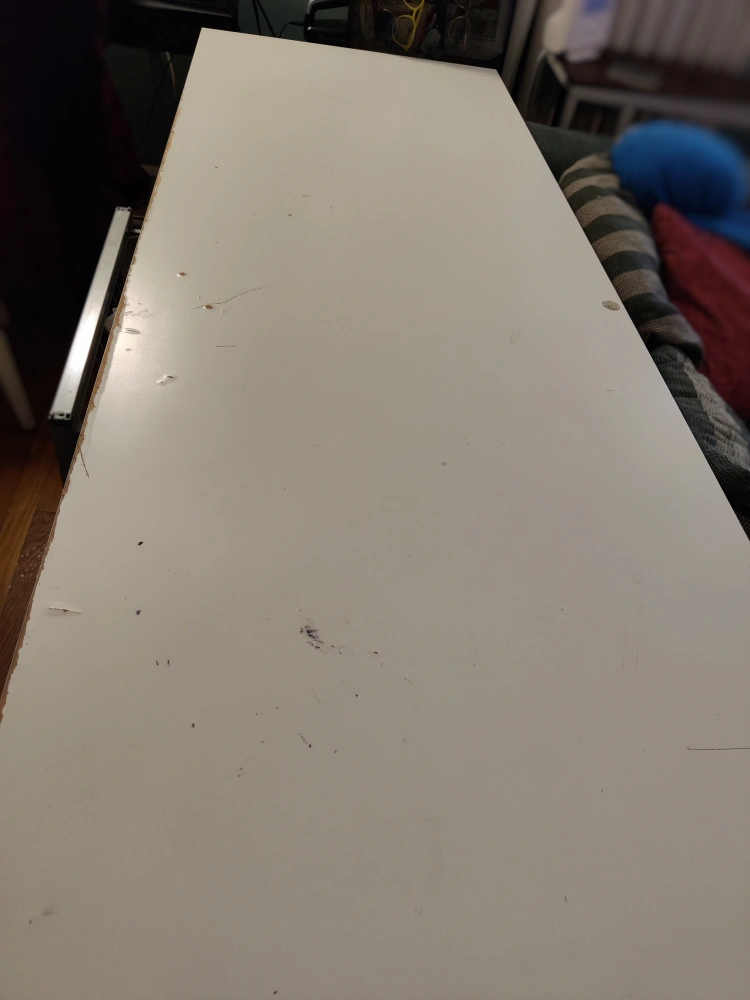 Well-used but still plenty sturdy desk from Ikea. This has been a great multi use project table and coworking desk for many years and still has lots of life left in it. It has scratches and cosmetic damage to the surface from wear & tear, but it's still solid, with little to no wiggle in the legs.