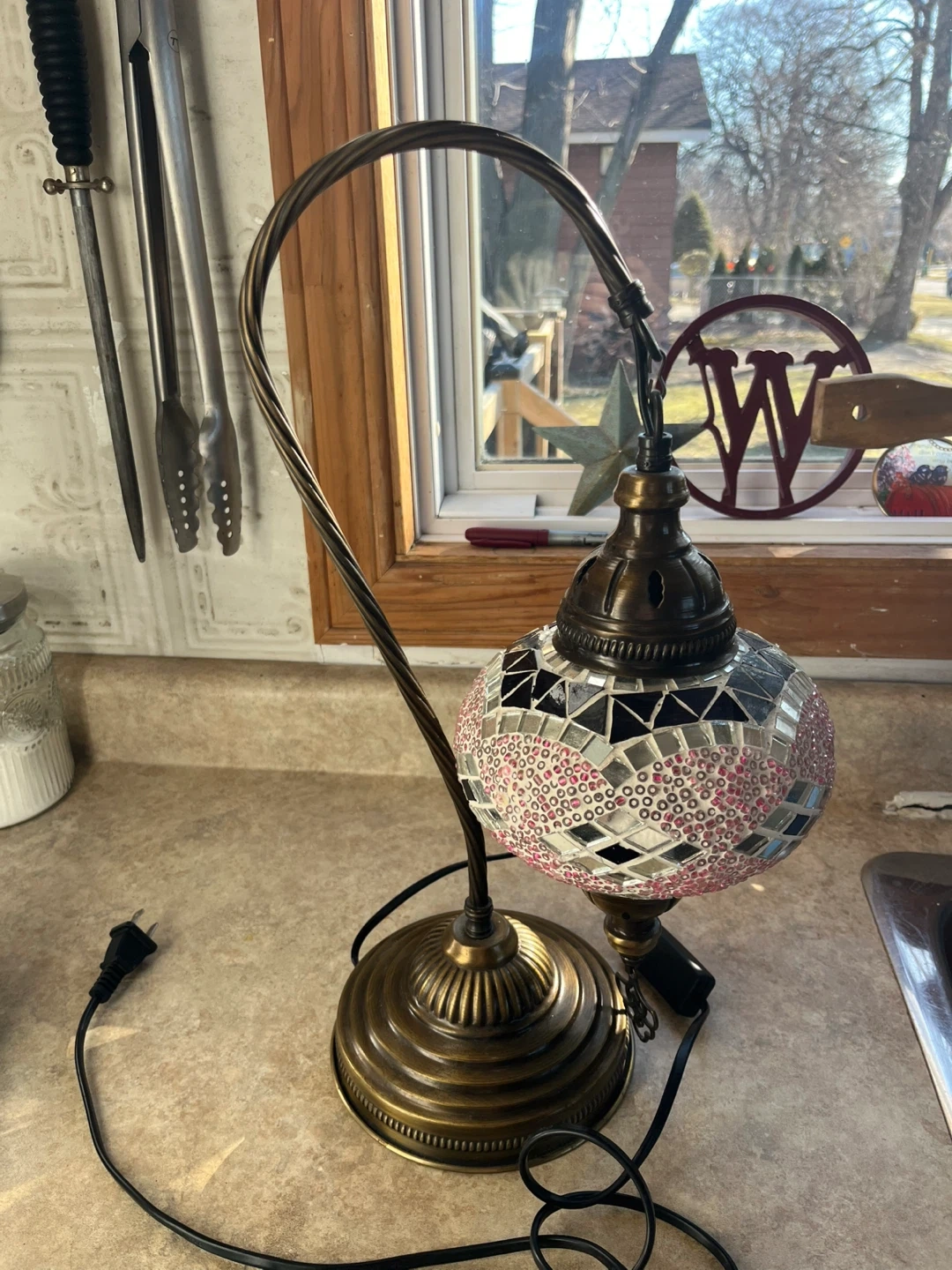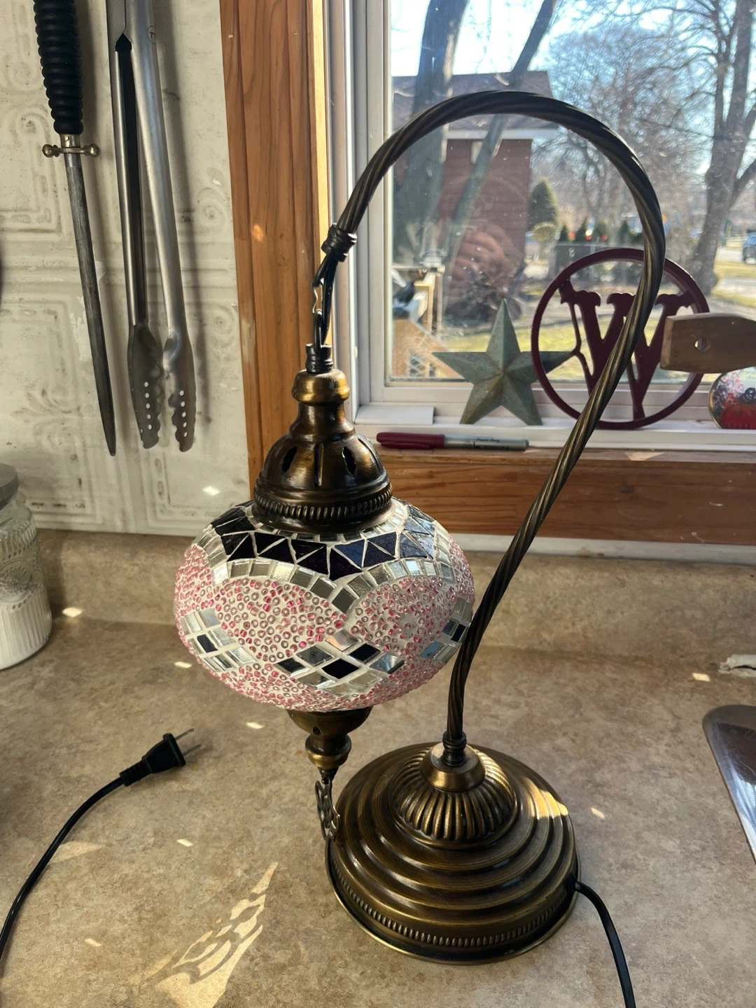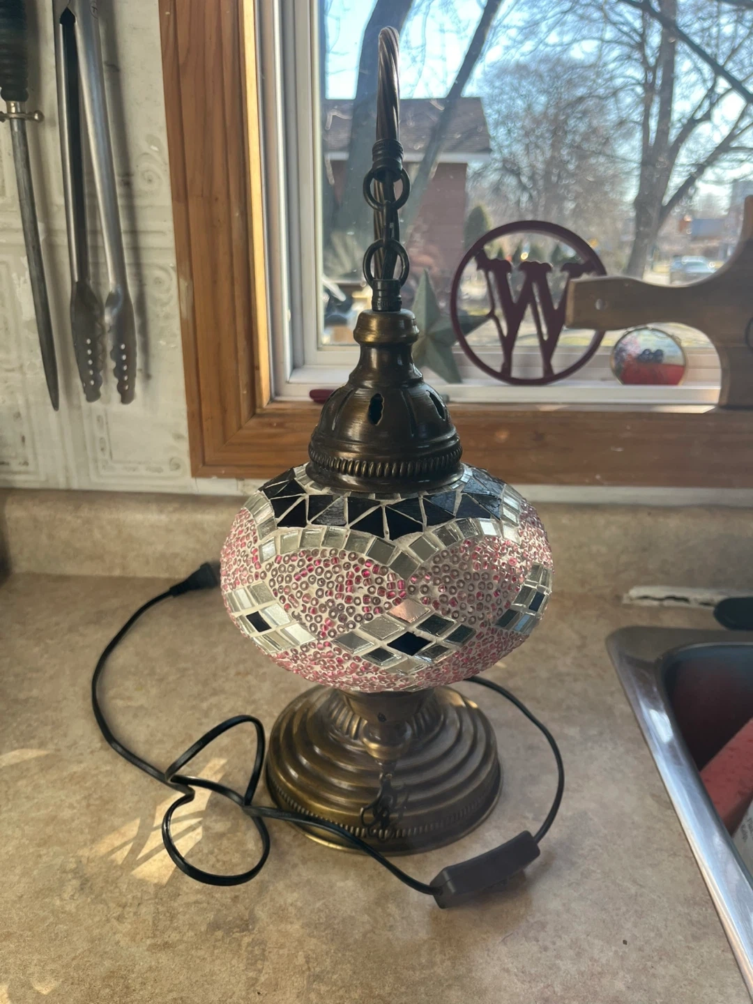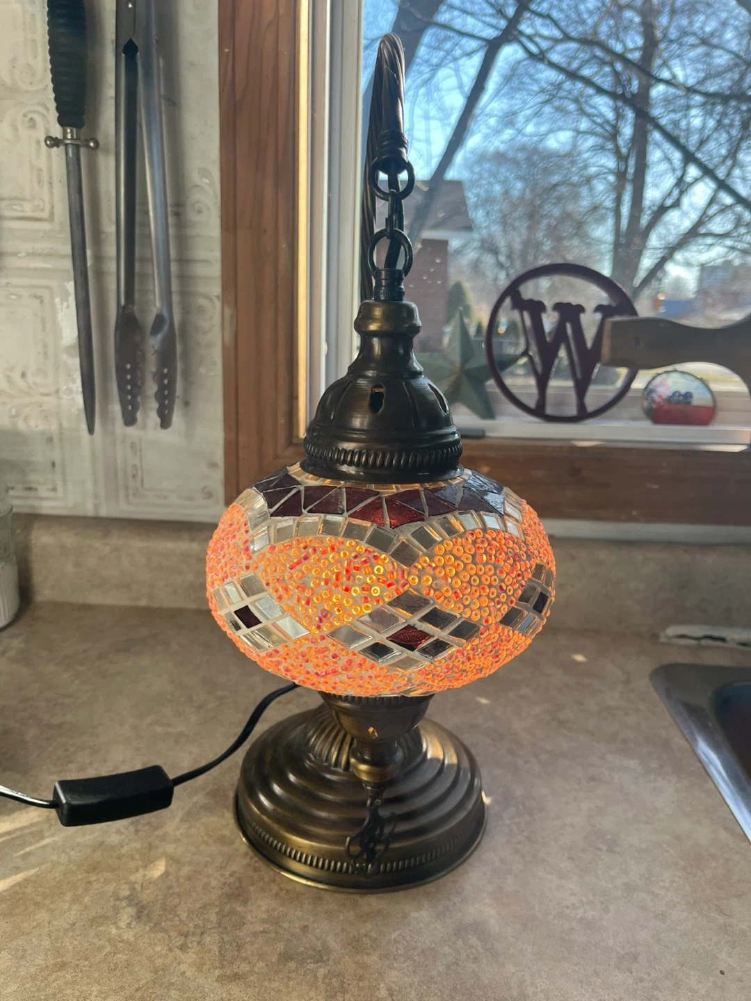 This is a decorative mosaic table lamp. It features a metal base and a glass shade with colourful mosaic tiles.