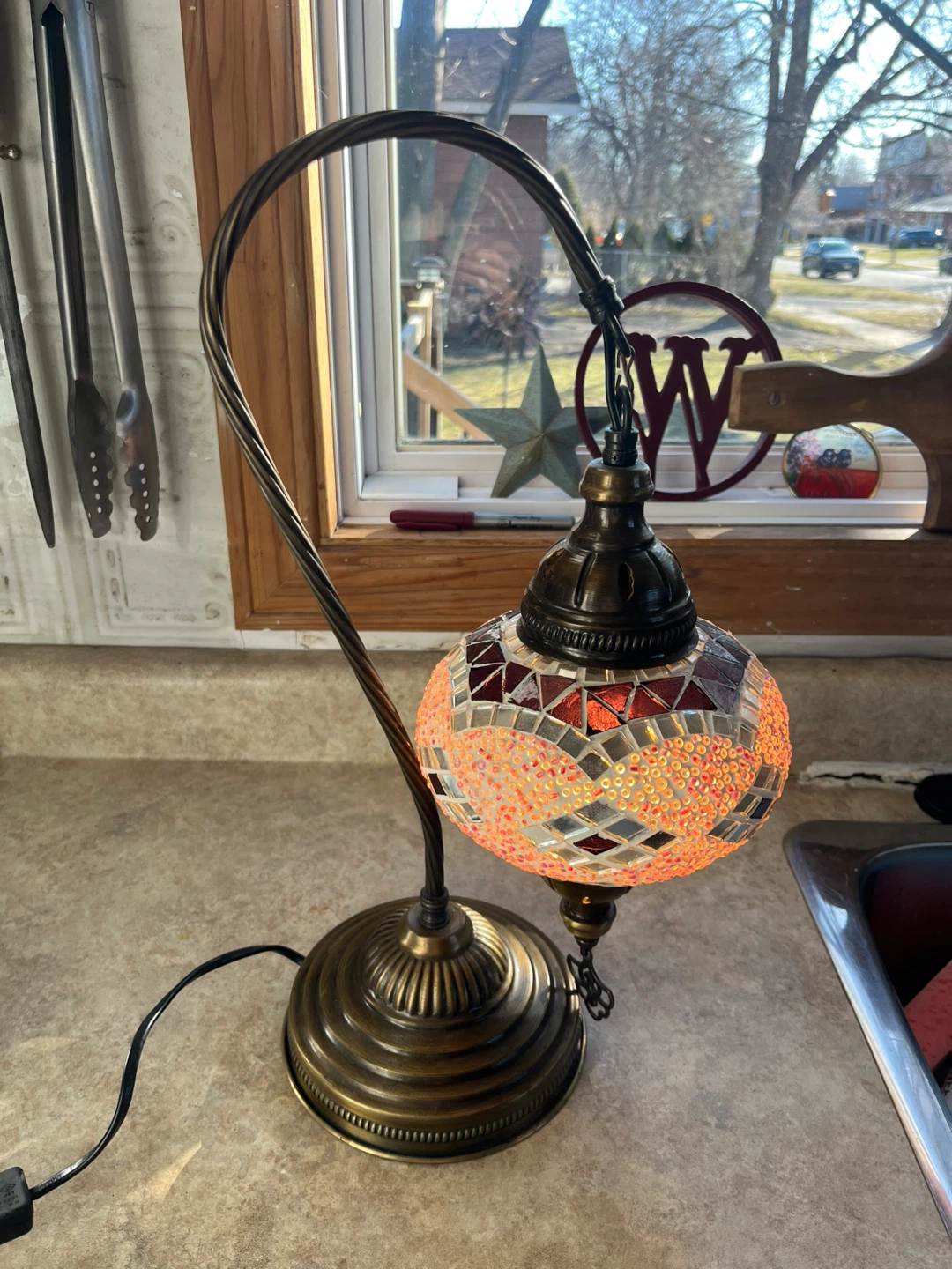 This is a decorative mosaic table lamp. It features a metal base and a glass shade with colourful mosaic tiles.