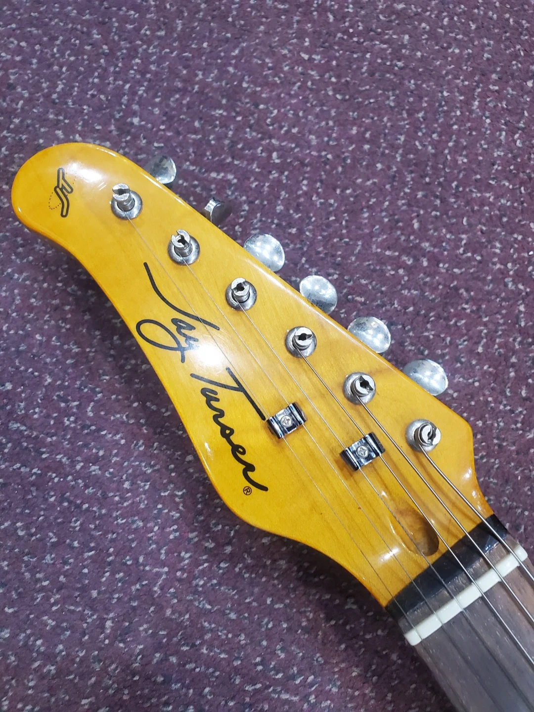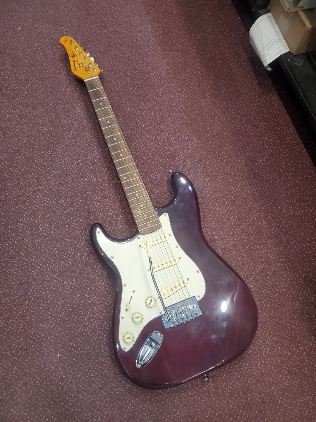 This is a left handed Jay Turser electric guitar. It's a six-string model with a dark burgandy finish and a white pickguard. It has three single-coil pickups and a tremolo bridge. This guitar is suitable for learning or casual playing.