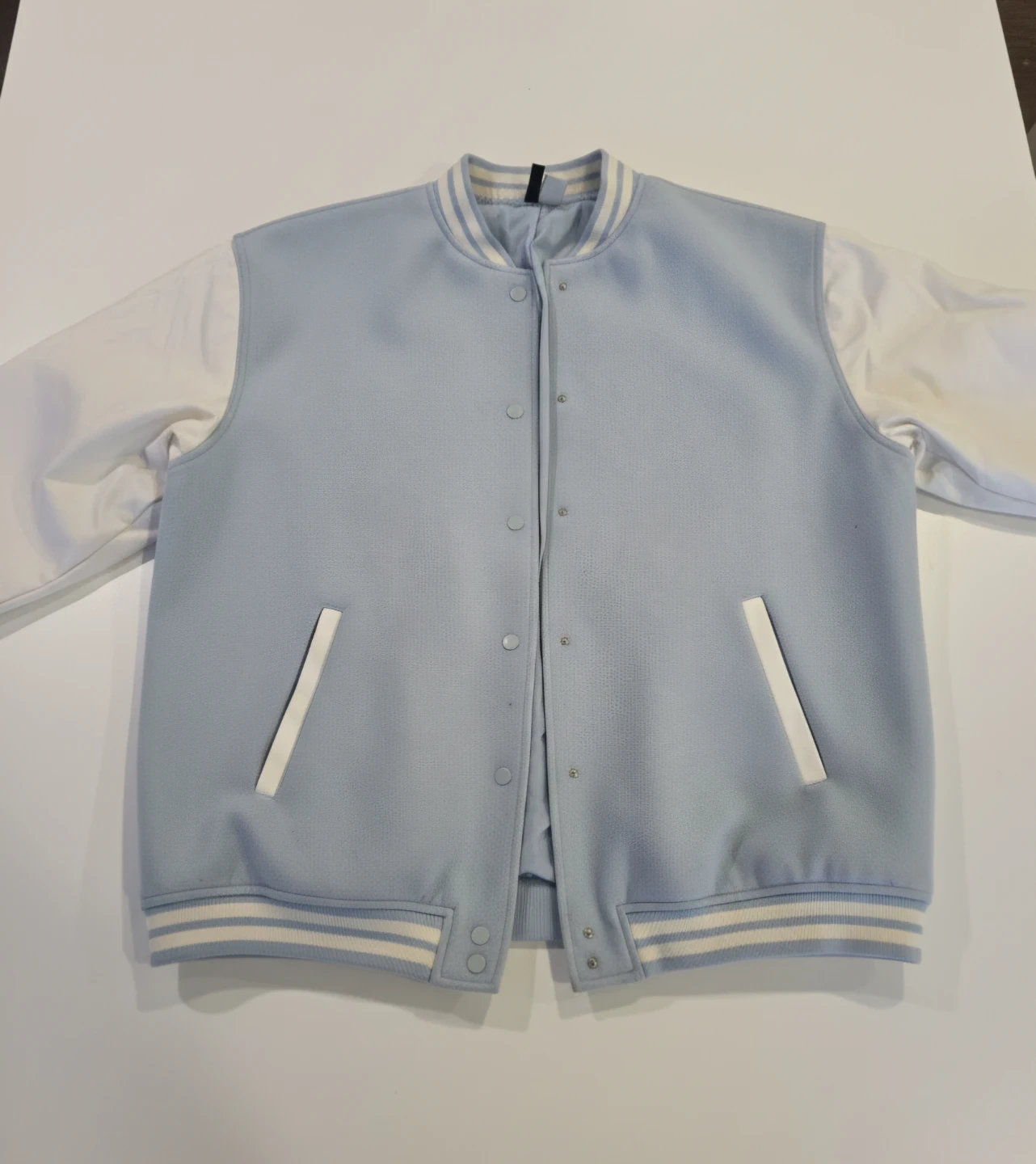 Selling a stylish H&M Divided varsity jacket in size XL! It's a light blue colour with white sleeves. Perfect for adding a cool, casual vibe to your wardrobe