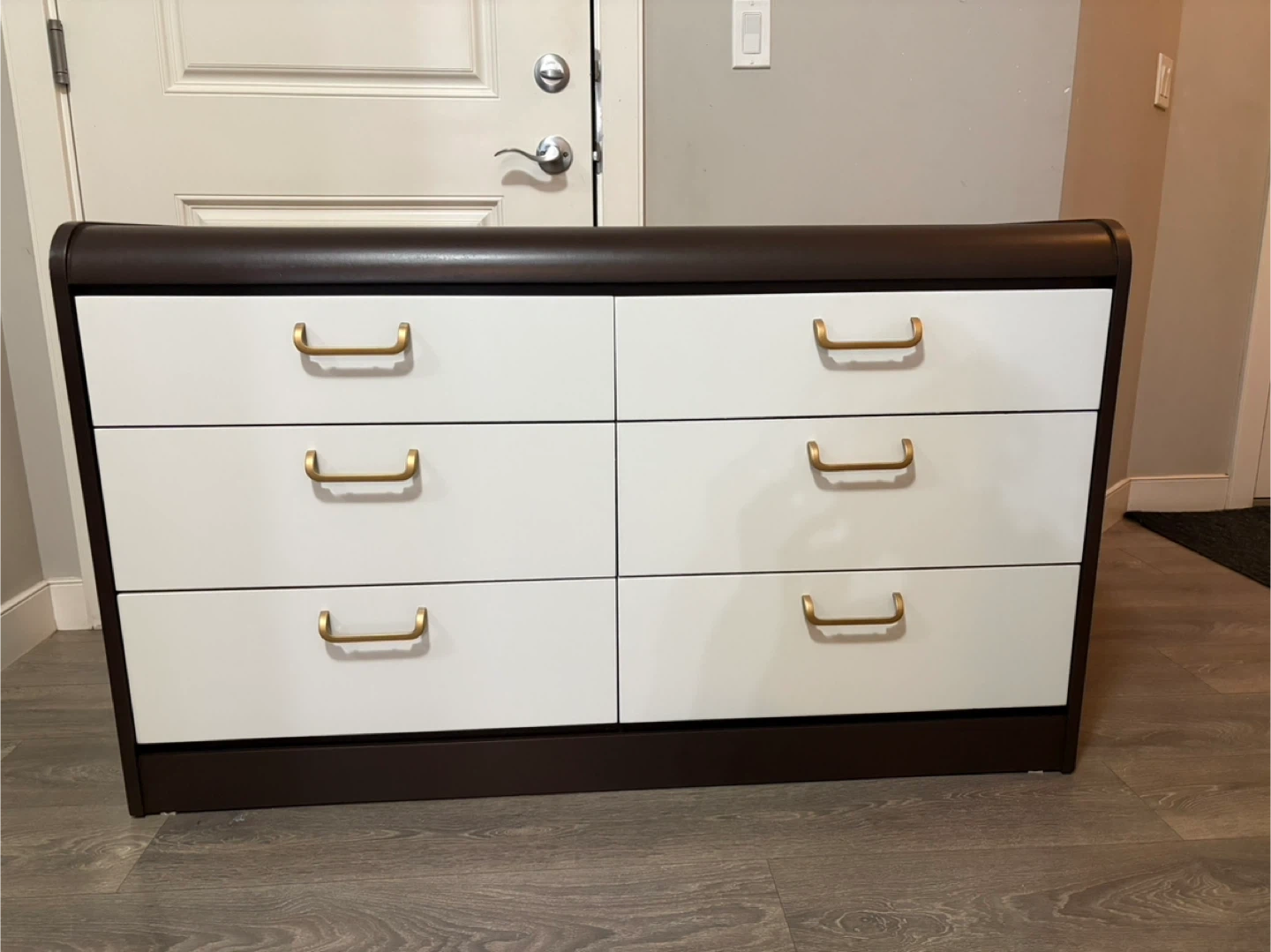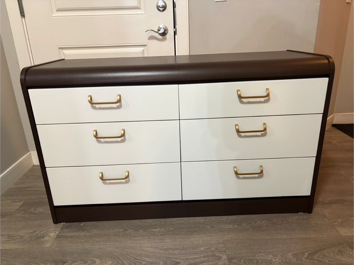This stylish refinished brown dresser features six white drawers, each equipped with sleek gold handles. It's in excellent condition. It is a functional and eye-catching piece of furniture. The drawers are very clean and slide smooth.