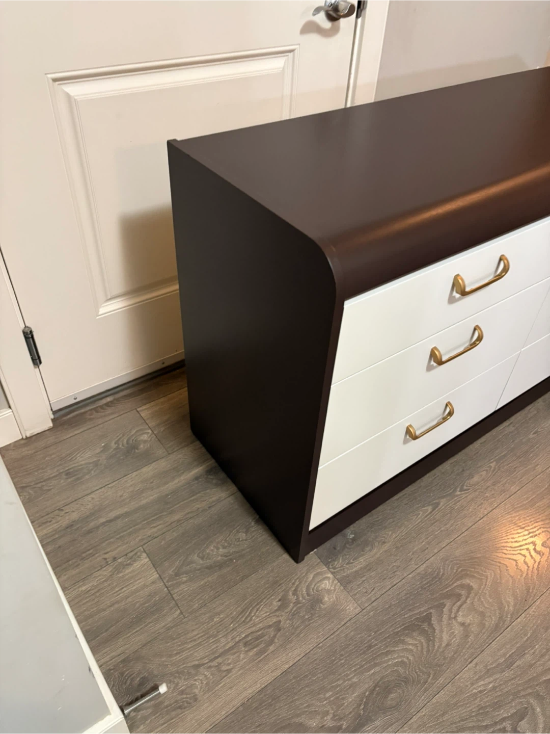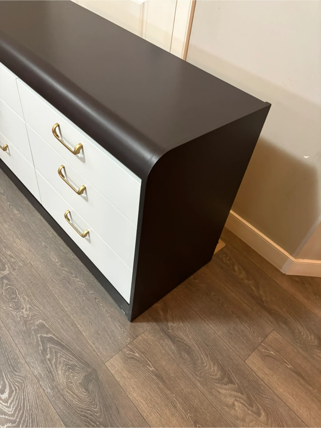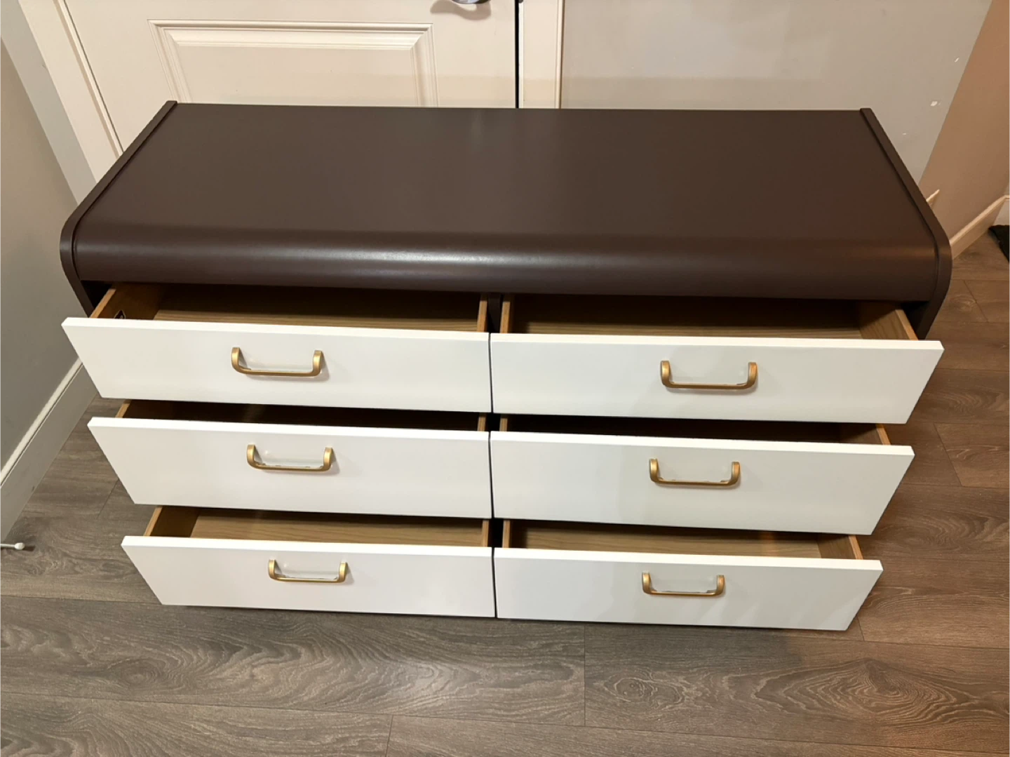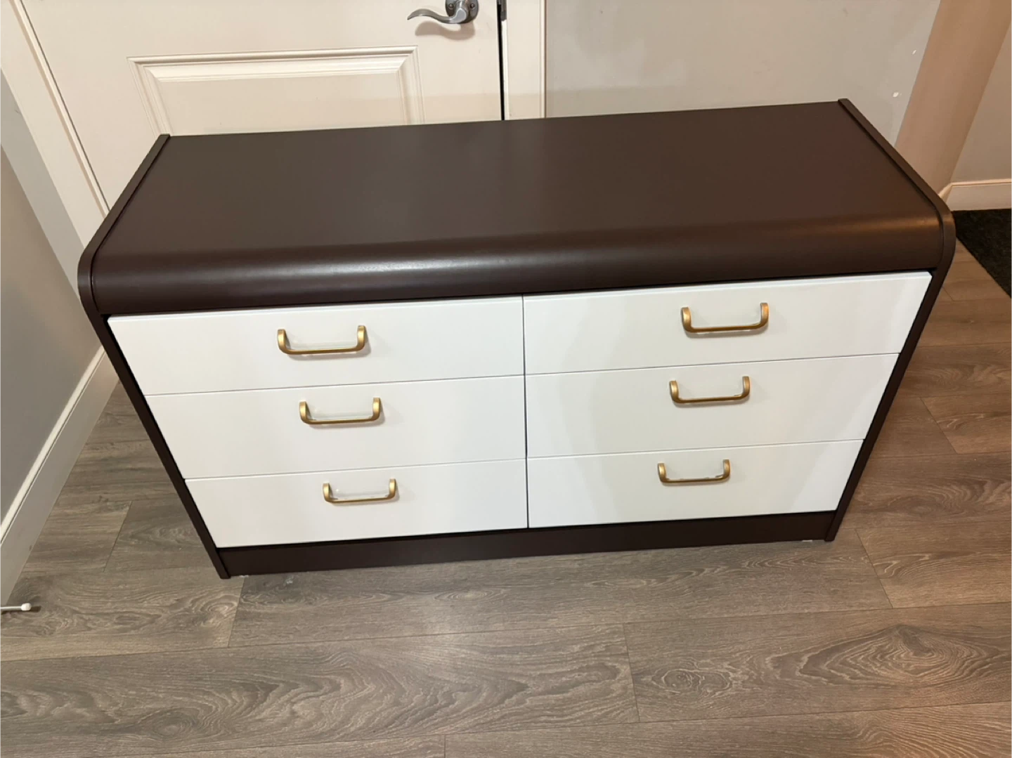 This stylish refinished brown dresser features six white drawers, each equipped with sleek gold handles. It's in excellent condition. It is a functional and eye-catching piece of furniture. The drawers are very clean and slide smooth.