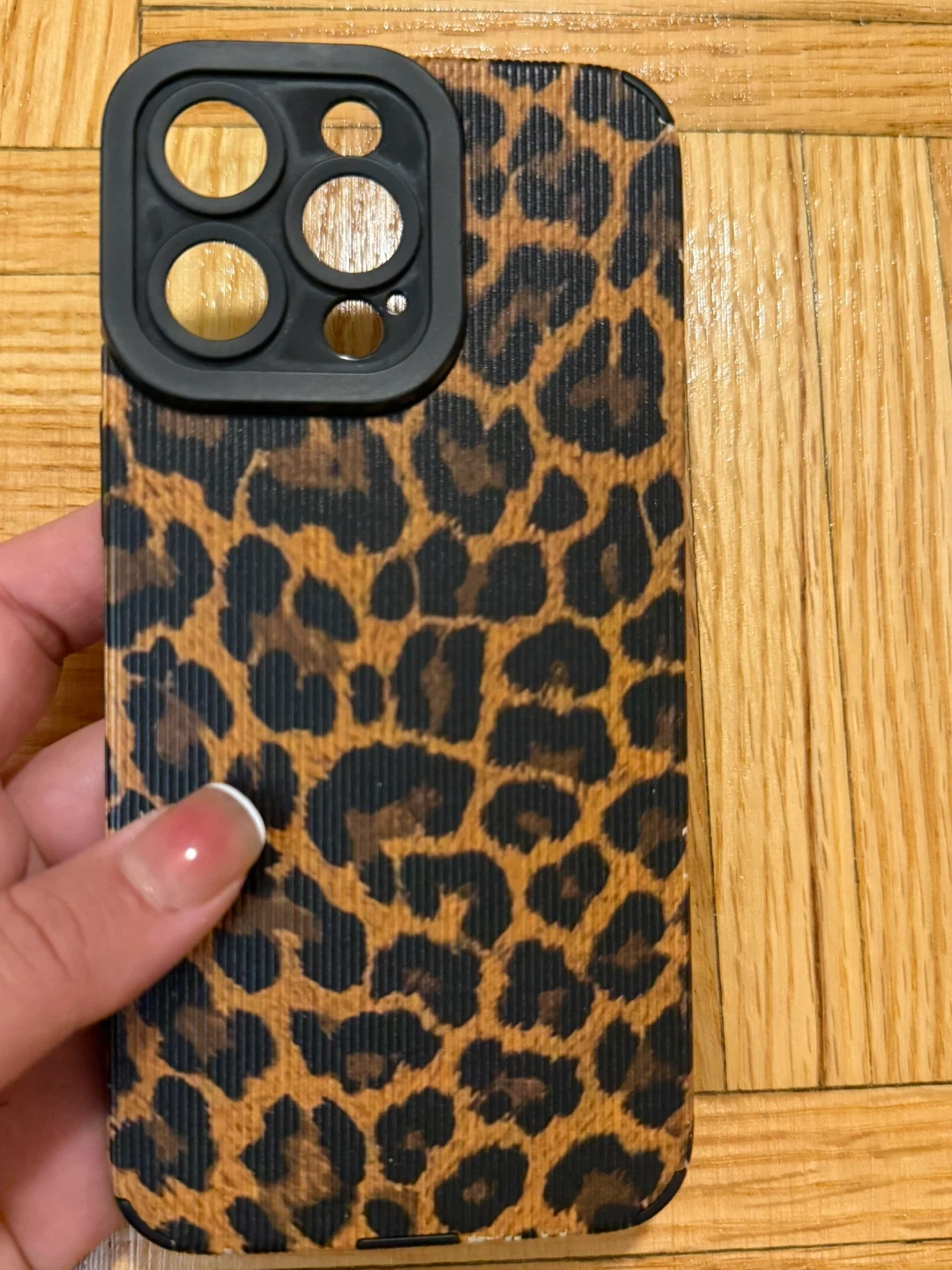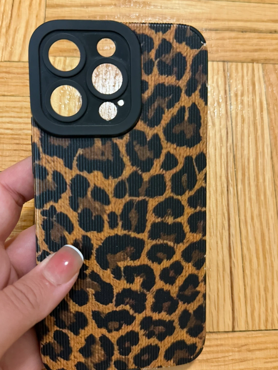 This phone case features a trendy leopard print design. It has a raised bezel around the camera for added protection. The textured sides offer a better grip. It's a stylish way to protect your phone!