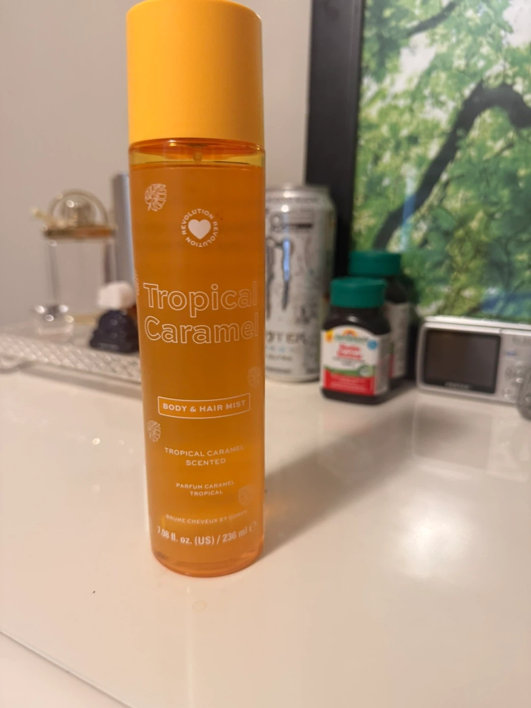 Three Revolution Body & Hair Mists available: Watermelon Sunset (sweet watermelon & berry scented), Tropical Caramel (tropical caramel scented), and Peach Fizz (fresh peach & citrus scented). Each bottle contains 7.95 fl. oz. (US) / 236 ml. It's a great way to add a pleasant scent to your hair and body!