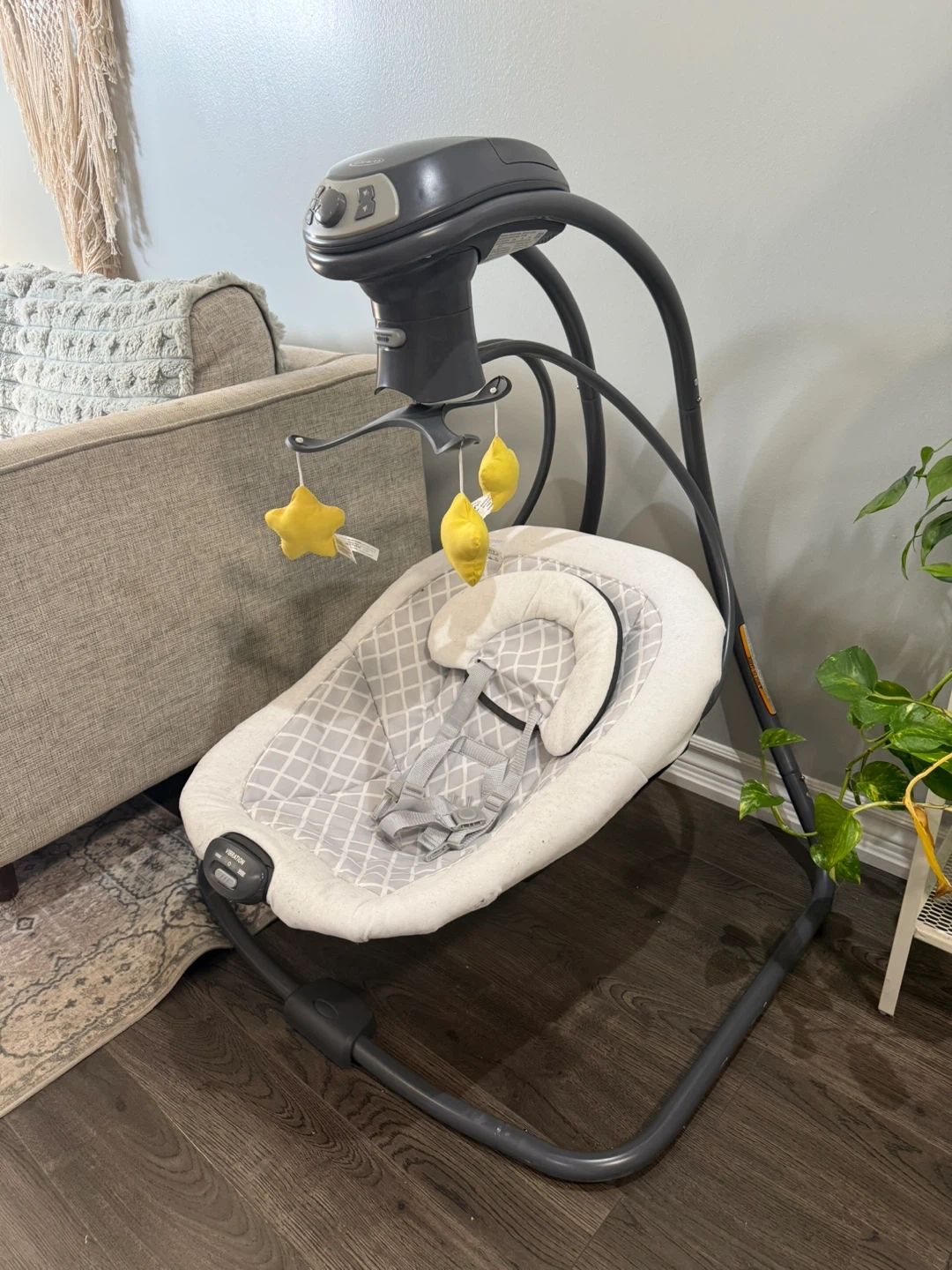 Selling a gently used Graco baby swing! It's in great condition and has provided many hours of soothing for our little one. It features a comfortable seat with a cute pattern and hanging toys to keep baby entertained. Perfect for newborns up to 9 months old!