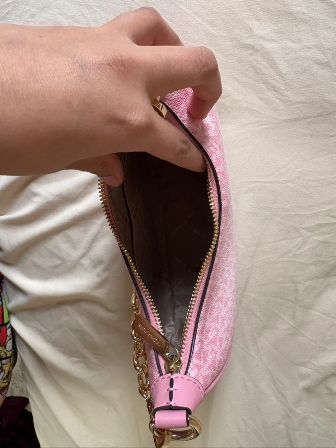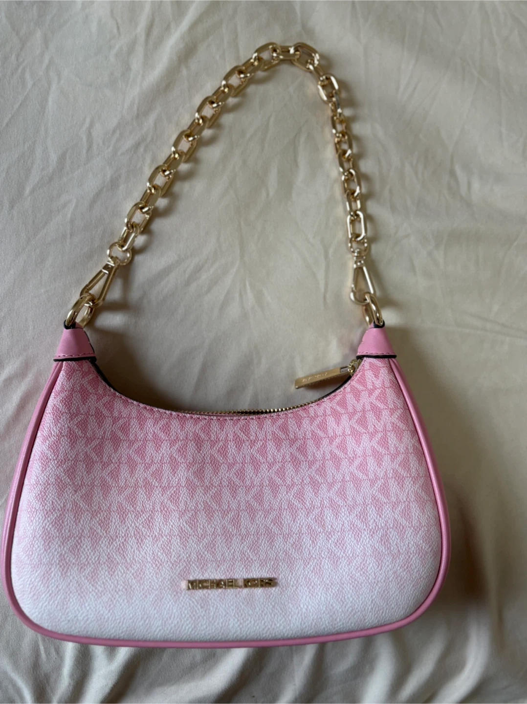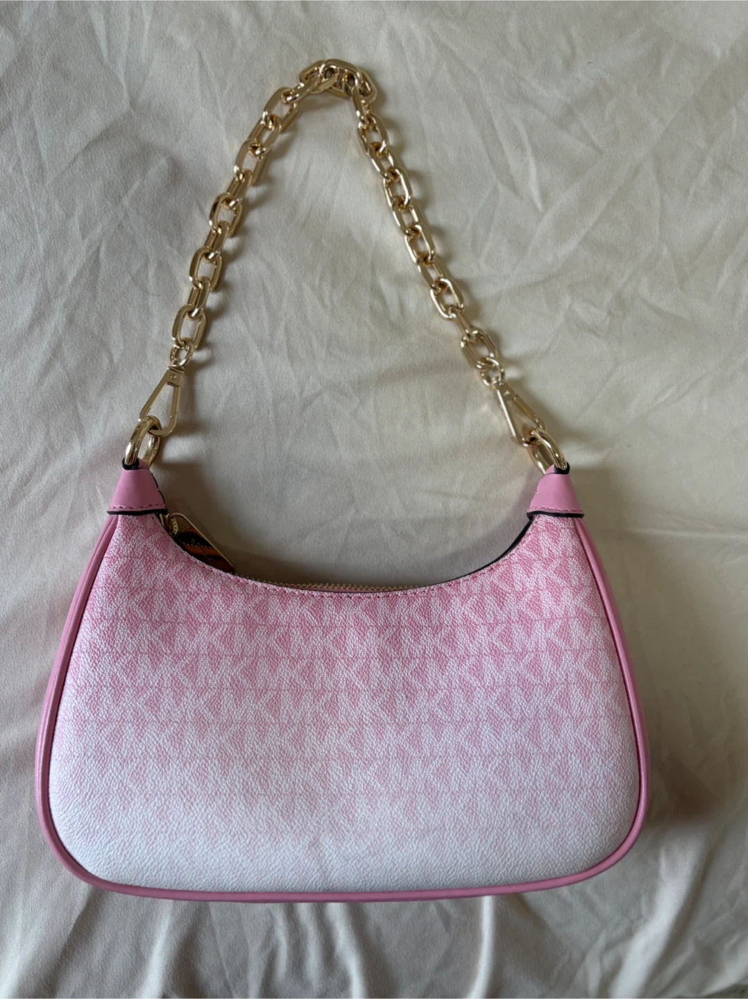 This stylish Michael Kors hobo bag features the brand's signature logo pattern in pink. It has a convenient zip closure and a chic gold chain strap. Perfect for adding a pop of color to any outfit!