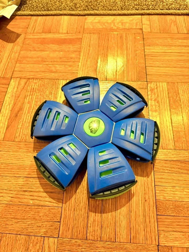 Blue collapsible Phlat ball. Brand new. Never used. Packaging got ruined but ball has never been used. Super fun for the kids to play with.
