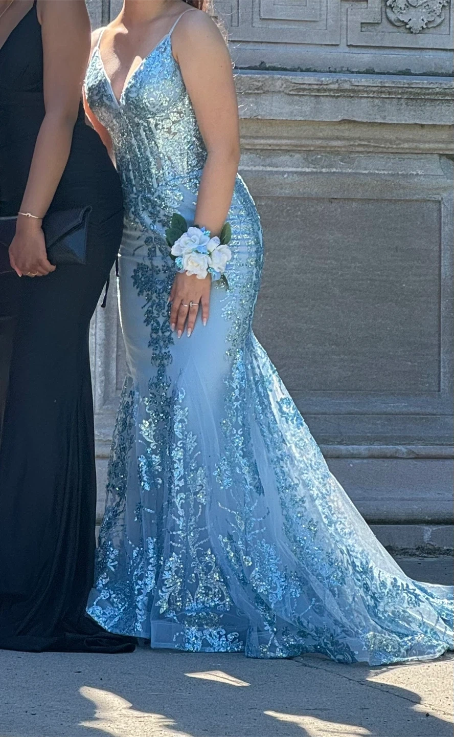 Beautiful light blue mermaid-style prom dress with all-over sparkle and intricate floral embroidery. It features a V-neckline and a fitted bodice that flows into a dramatic flared hem. Perfect for formal events!