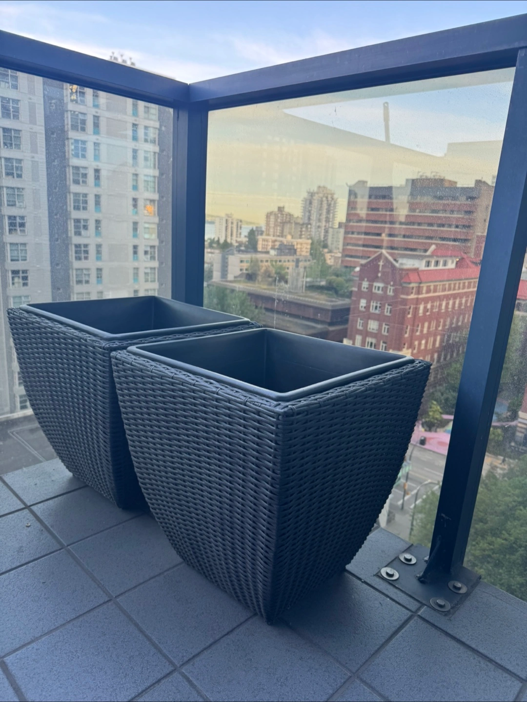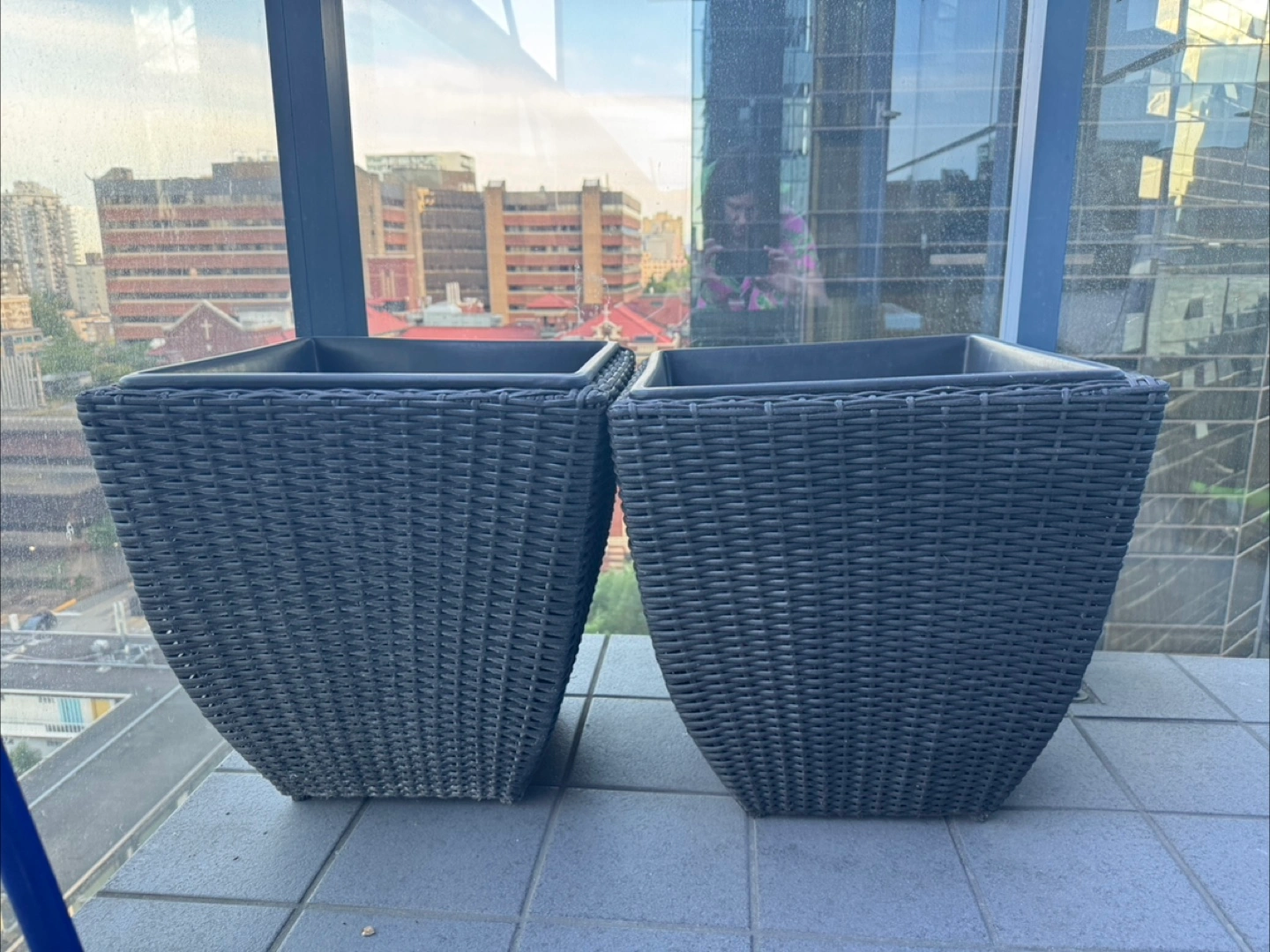 Two large square resin planters. Dark brown/black colour. Wicker design. Great for balcony or patio.