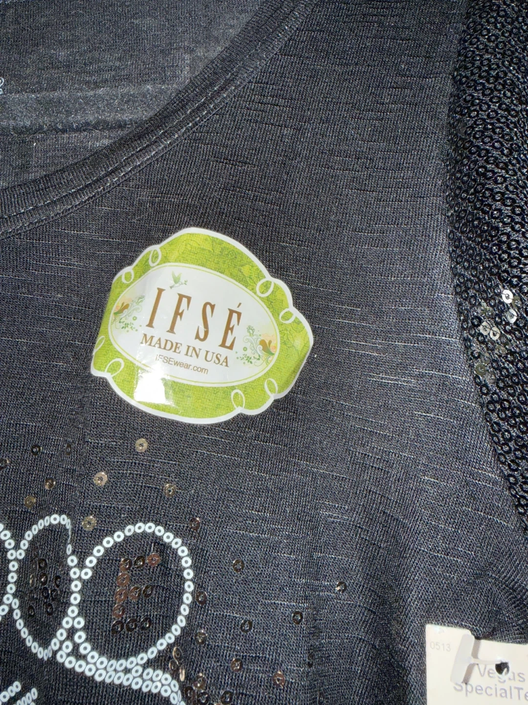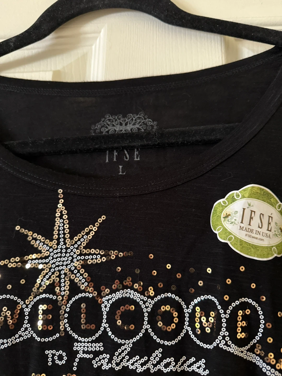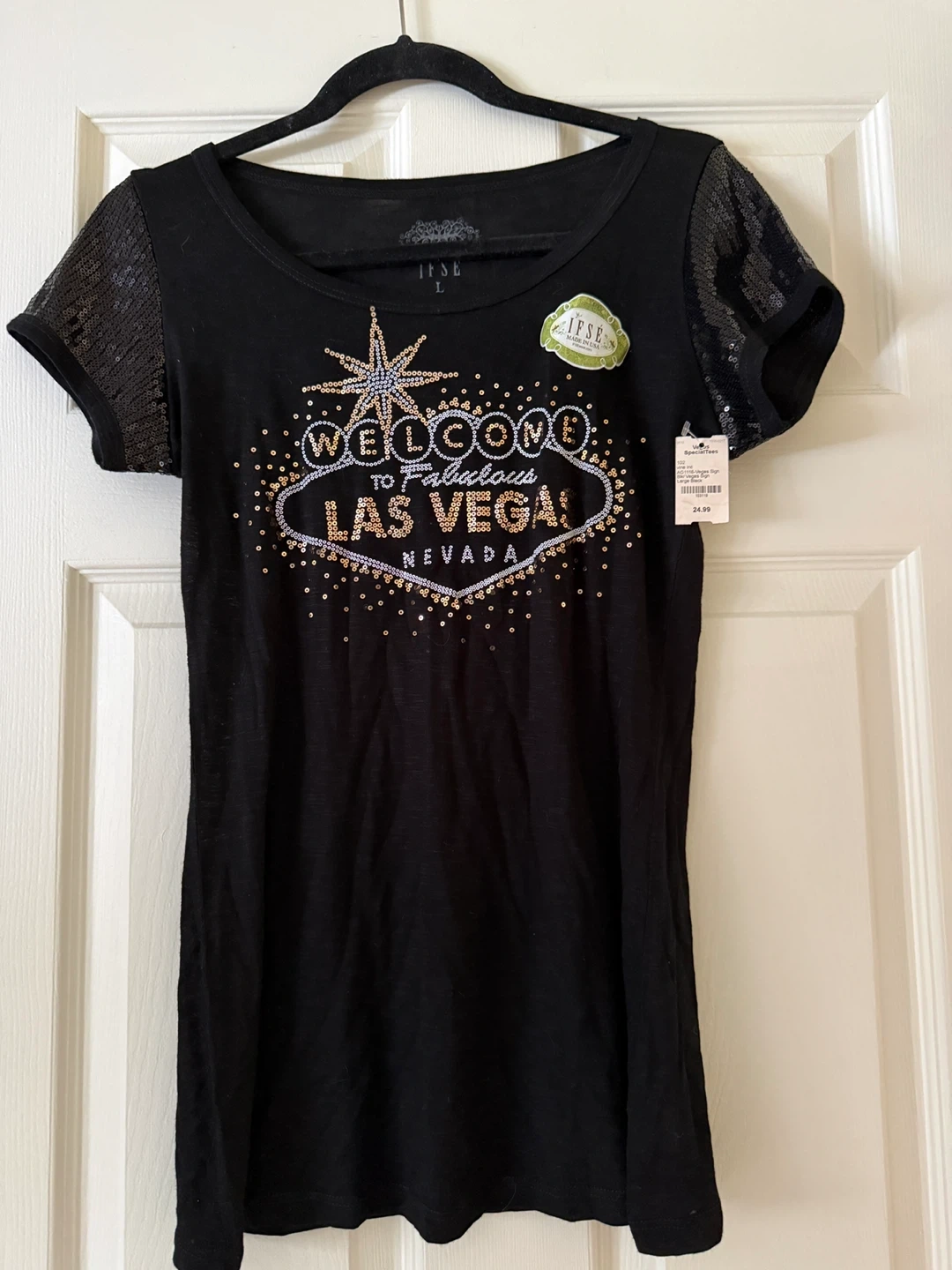 This black IFSE t-shirt features a "Welcome to Fabulous Las Vegas, Nevada" graphic made with sequins and beading. It has sequined short sleeves and is a size large. Made in the USA.