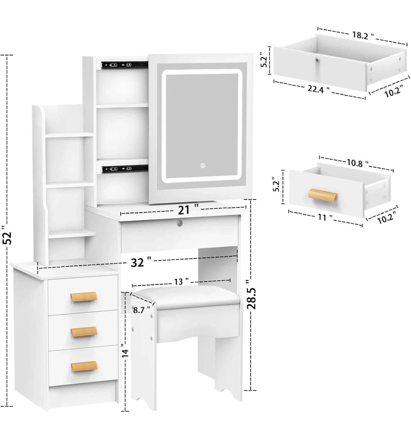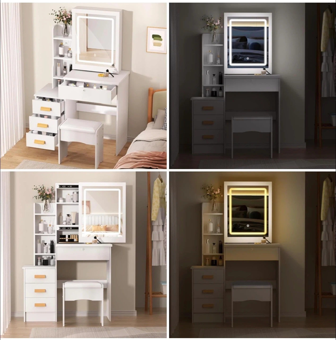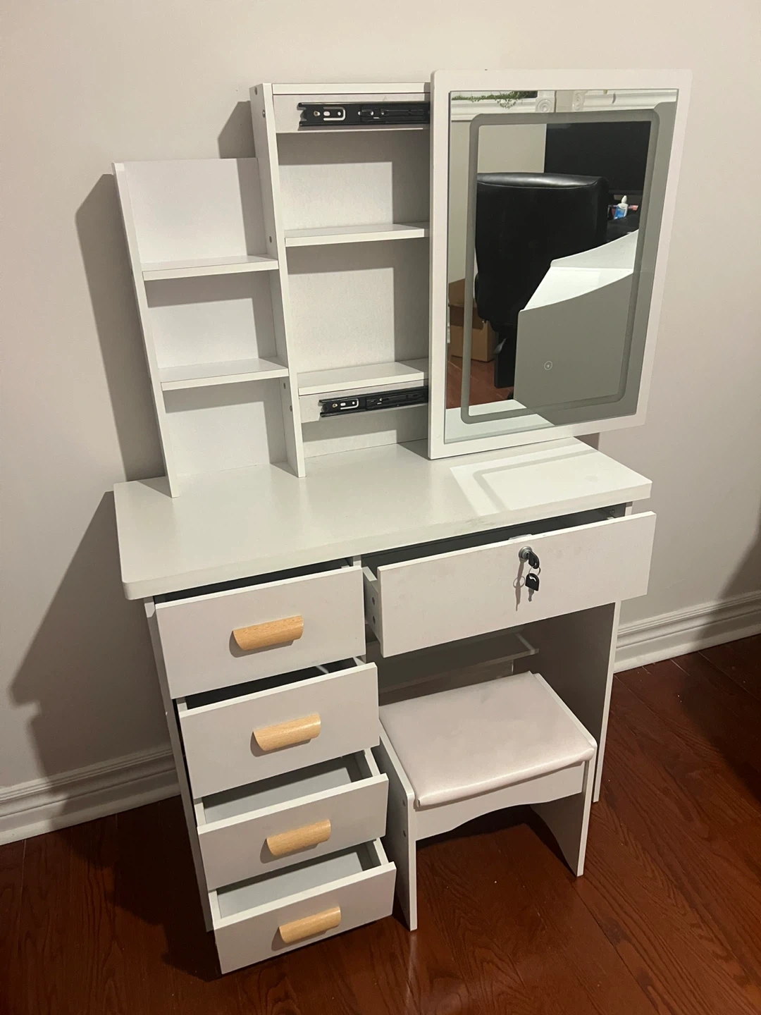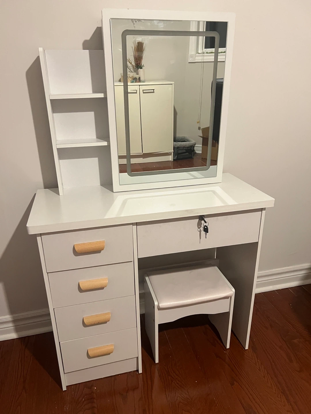 Selling a vanity makeup table desk with a lighted mirror and stool! It has a sleek design and offers sufficient storage space for your skincare, cosmetics, and jewelry. The vanity includes four drawers and a sliding mirror. Dimensions are shown in the picture.
