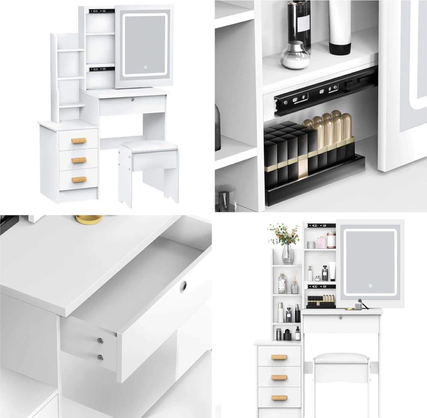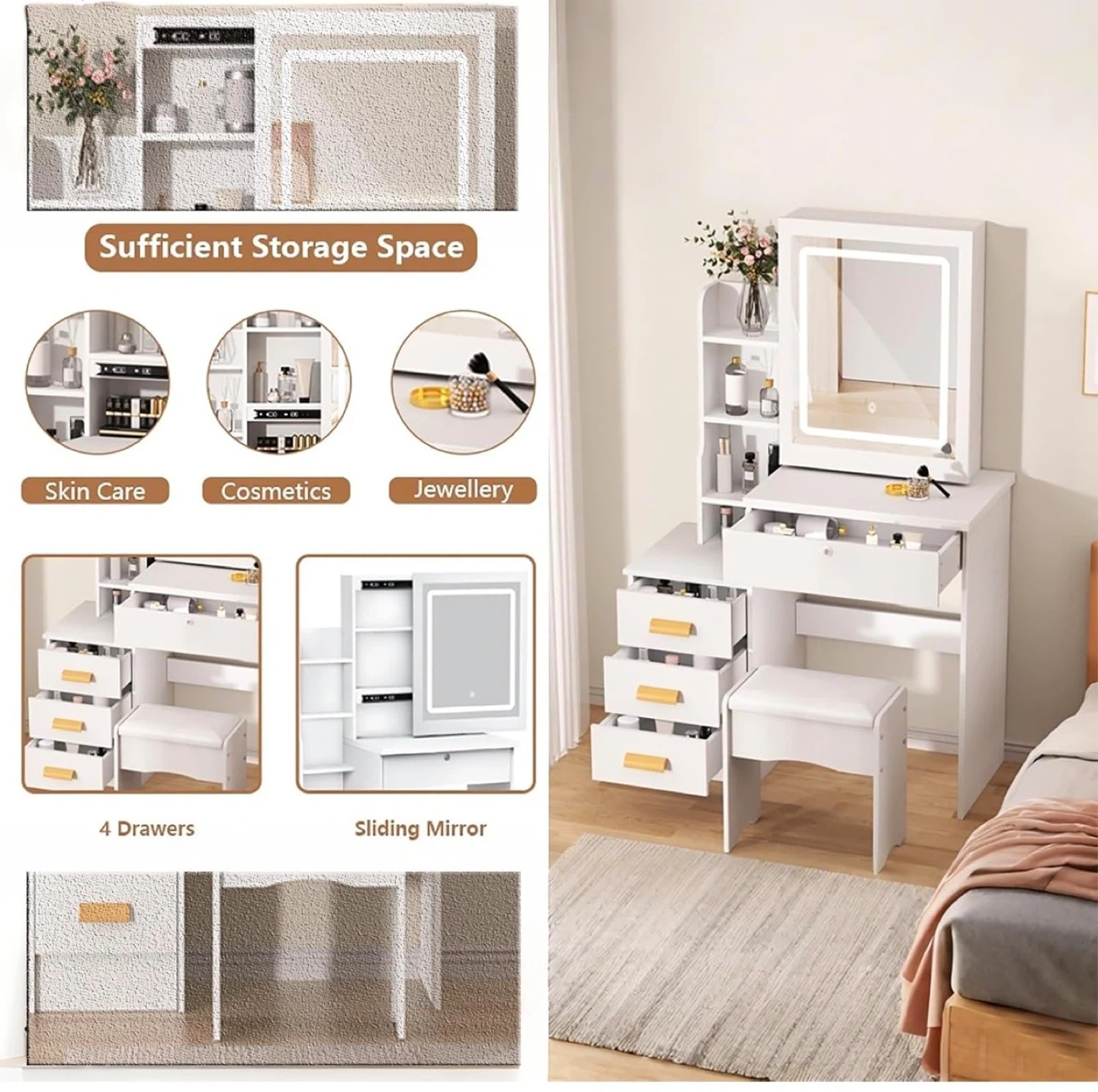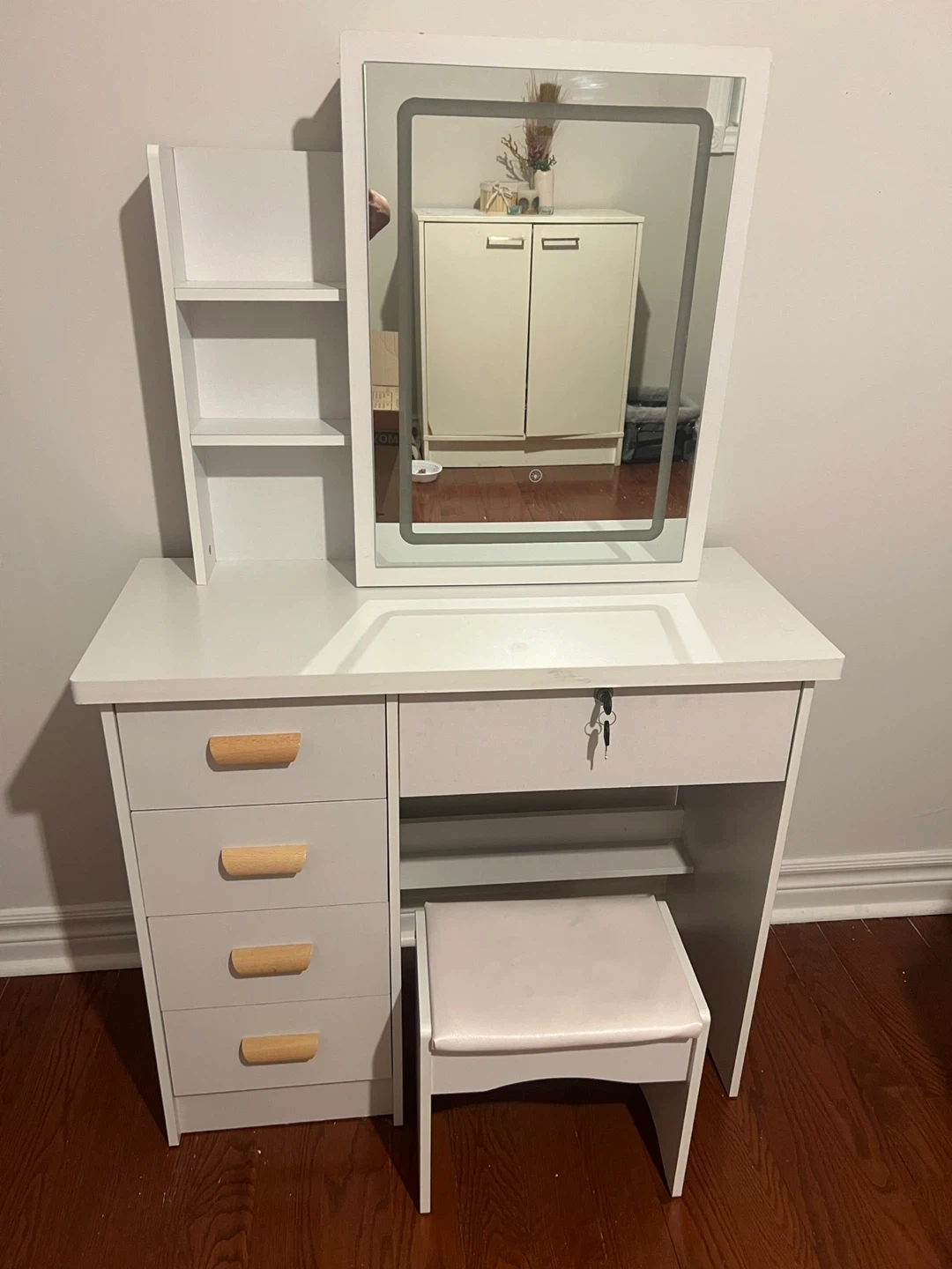 Selling a vanity makeup table desk with a lighted mirror and stool! It has a sleek design and offers sufficient storage space for your skincare, cosmetics, and jewelry. The vanity includes four drawers and a sliding mirror. Dimensions are shown in the picture.