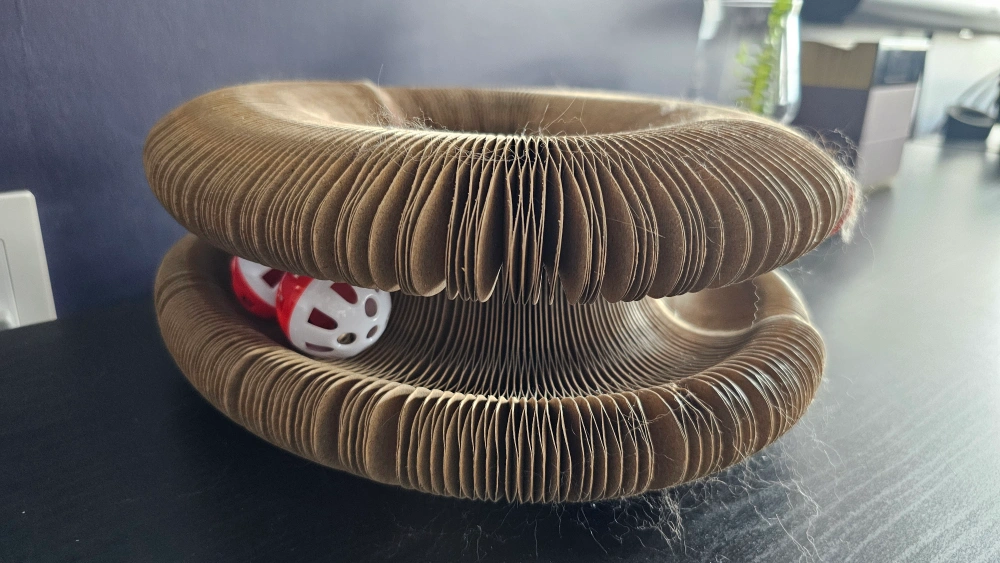 The cardboard cat scratcher has a unique shape, and is meant to be cozy and interactive (cat toy balls are included). 2 together and they have a magnetic end so they can be separated or conbined.