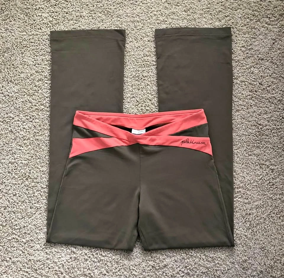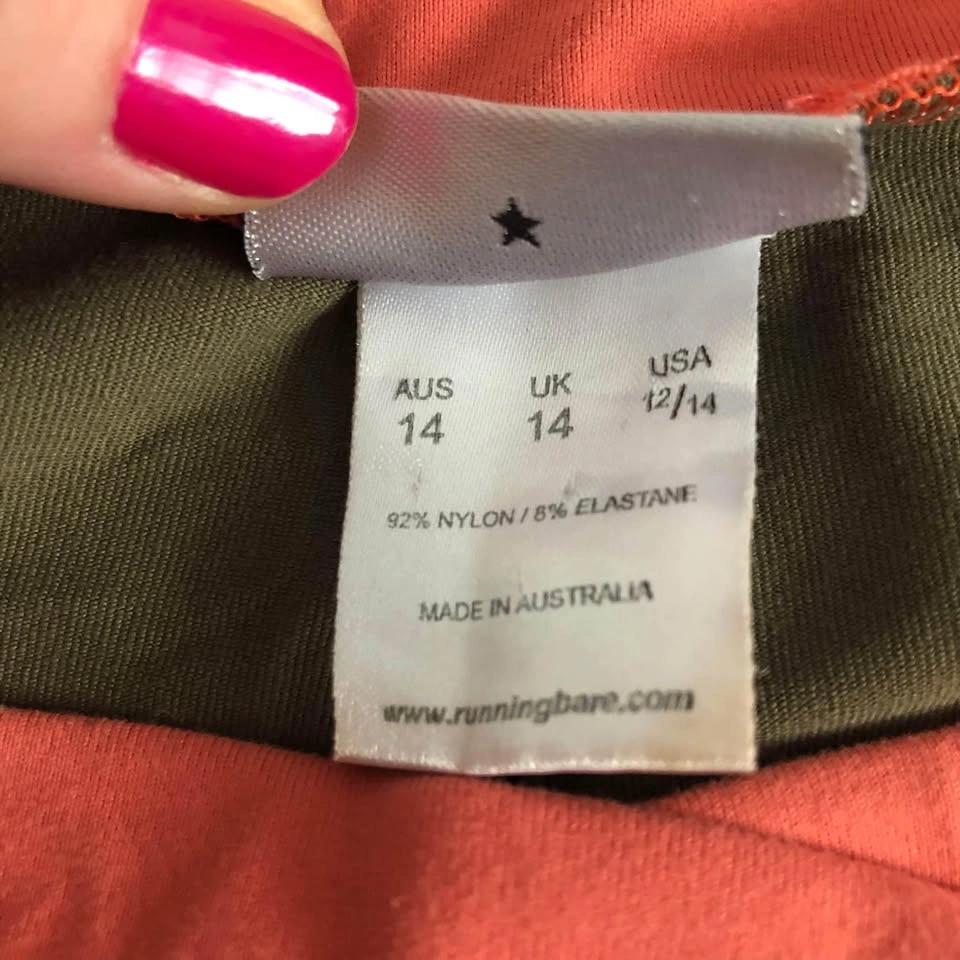 12Running Bare 'Platinum' leggings with a bootcut / slight flare leg. Great quality leggings in a neutral olive green with coral pink waistband. These pants are in very good, pre-loved condition and are perfect for the gym! Model pictures to illustrate fit. - Stretchy & moisture wicking for maximum comfort - Smooth waistband is comfortable and won't dig in - Fitted through the thigh with a slight flare from the knee - Chafe resistant to limit rubbing AUS 14, fits approx. Size US 10 92% Nylon, 8% Elastane Made in Australia Measurements are approx.: Length 100cm Waist 38cm Rise 23cm Inseam 78cm Cuff 23cm