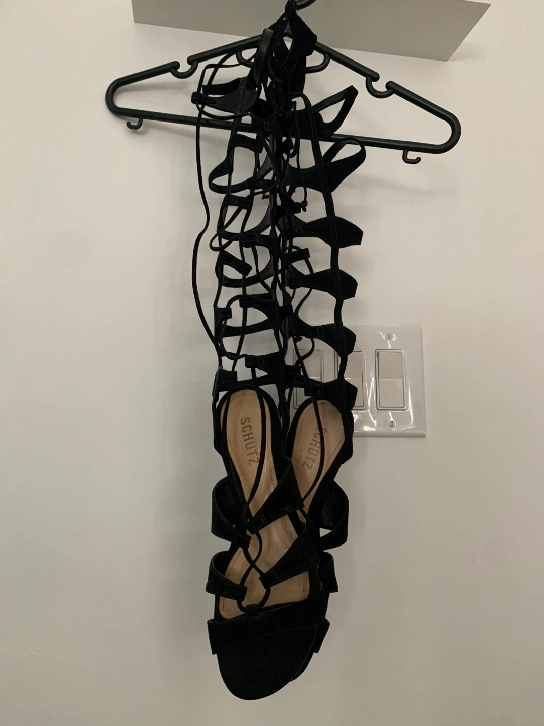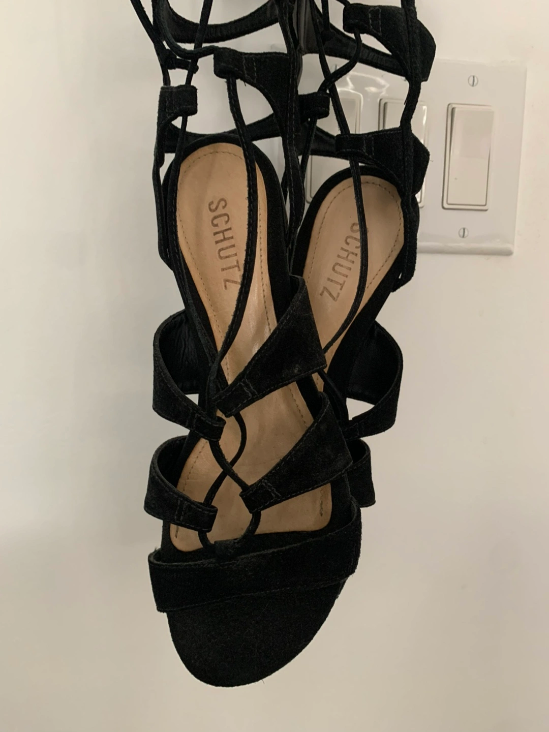 Selling a pair of Schutz lace-up gladiator sandals in black suede.