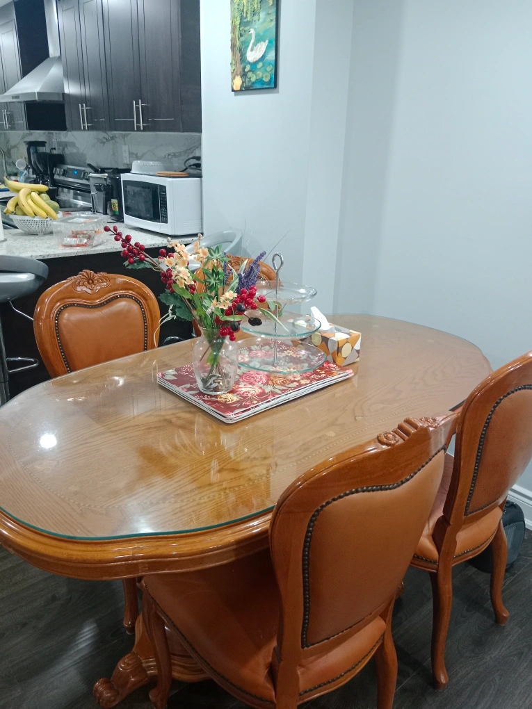 Beautiful oval dining table with four matching chairs. Glass top. Ornate wooden legs and frame. Brown leatherette chairs. Perfect for smaller spaces.