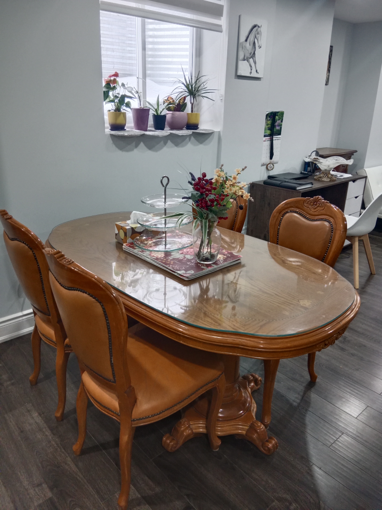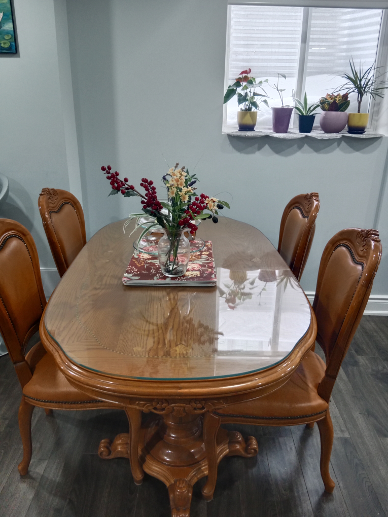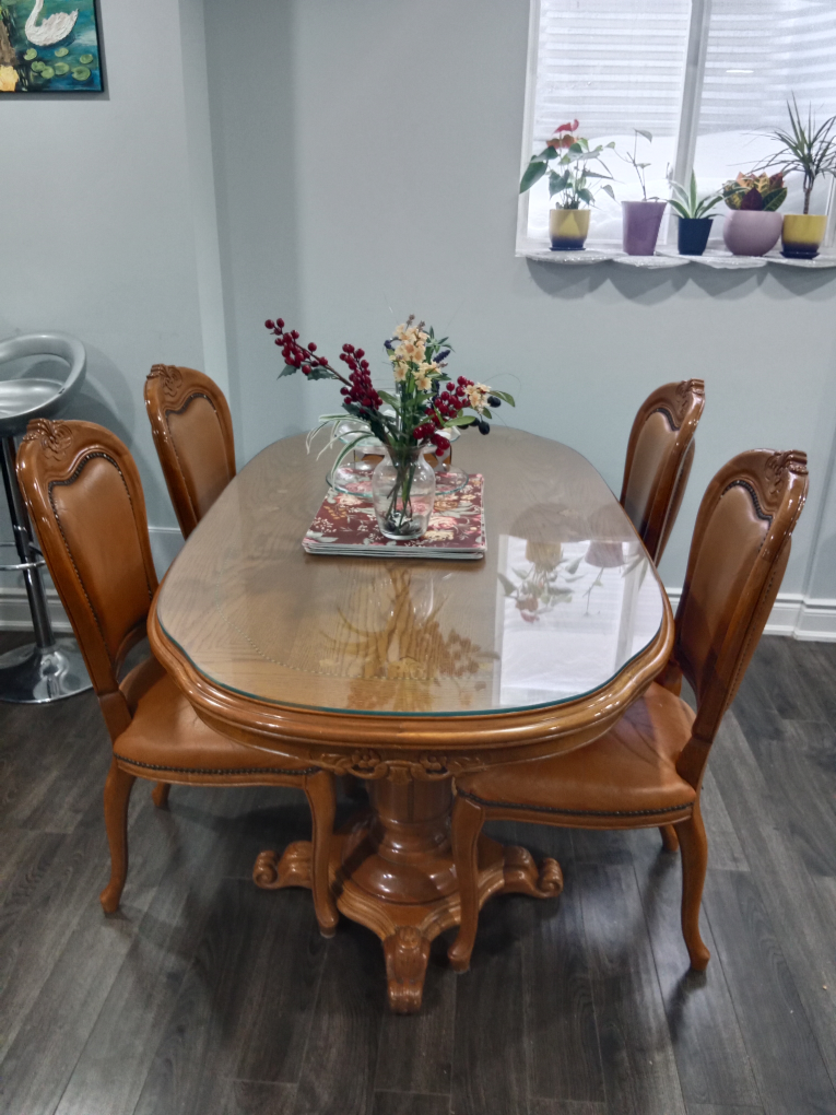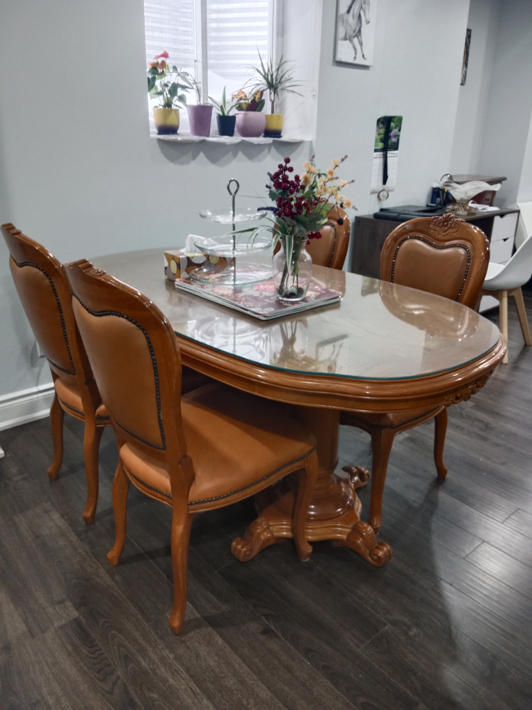 Beautiful oval dining table with four matching chairs. Glass top. Ornate wooden legs and frame. Brown leatherette chairs. Perfect for smaller spaces.