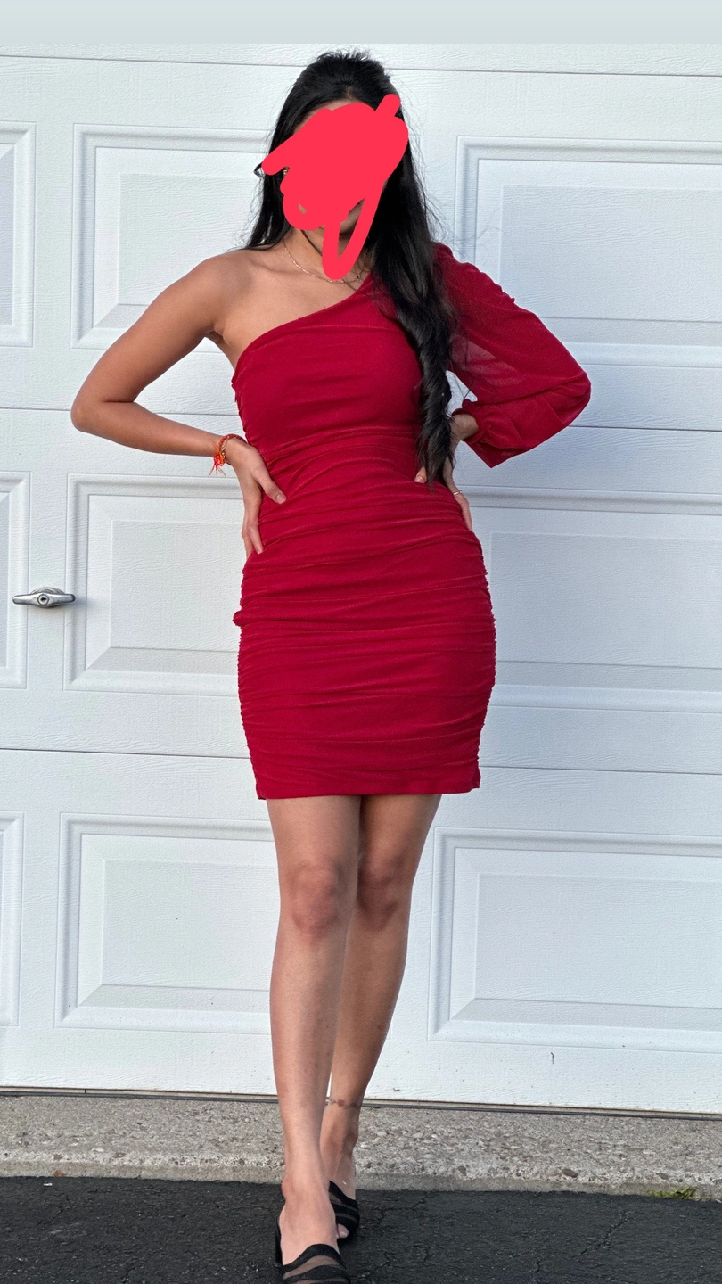This is a red one-shoulder mini dress with a long sleeve on one side. The dress is fitted and has a ruched bodice. It is perfect for a night out or a special occasion.