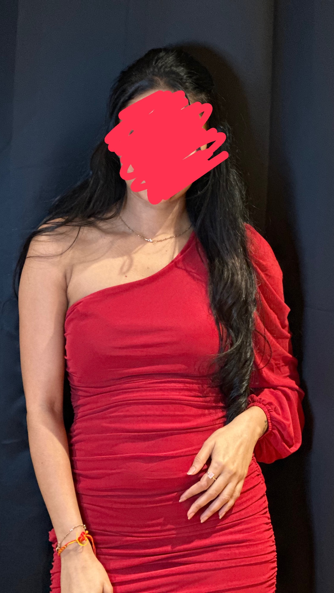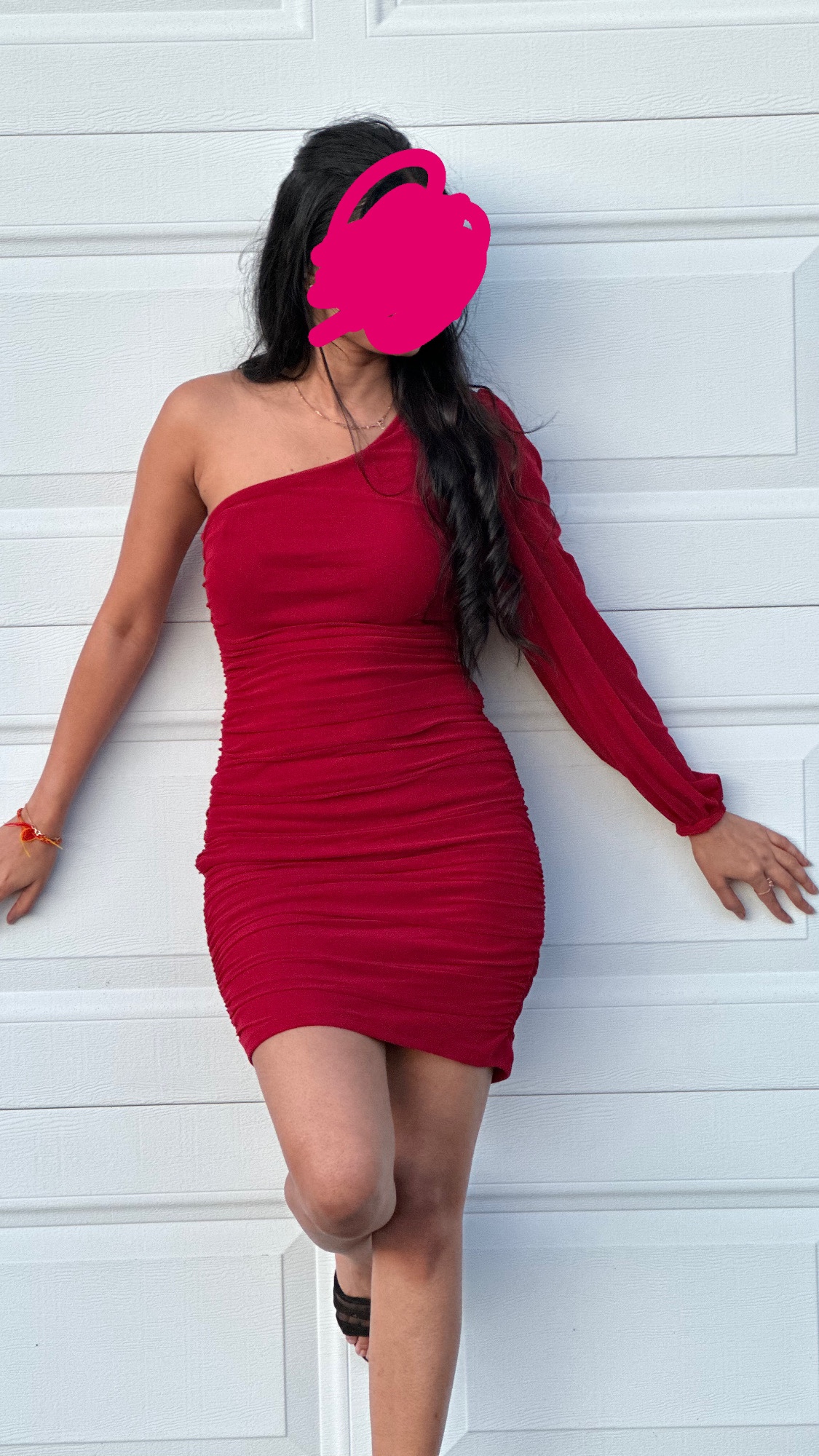 This is a red one-shoulder mini dress with a long sleeve on one side. The dress is fitted and has a ruched bodice. It is perfect for a night out or a special occasion.