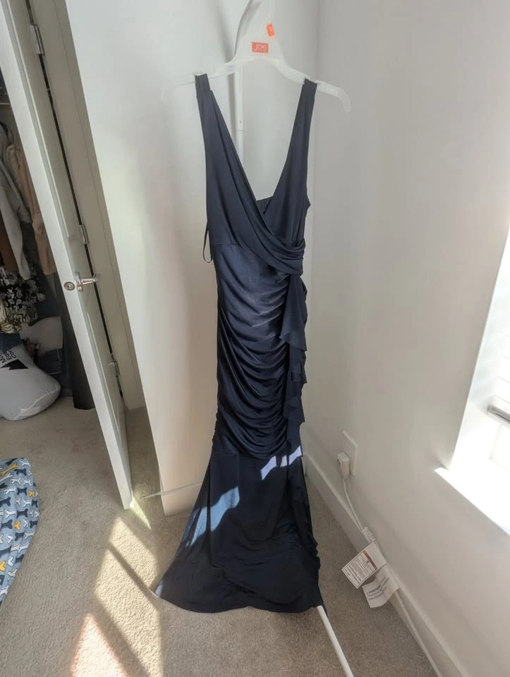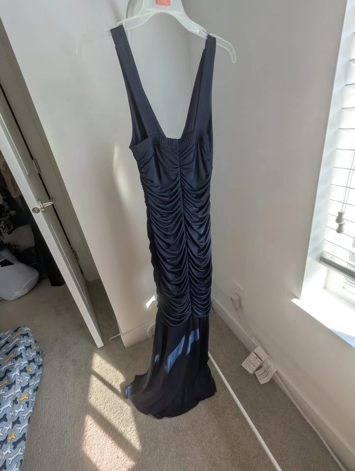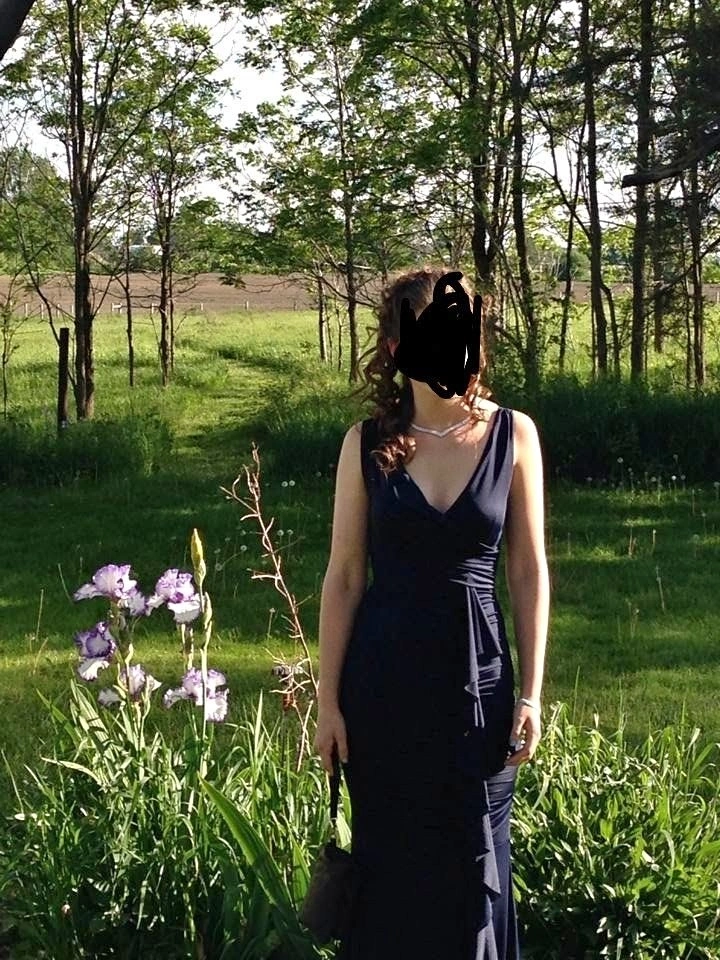 My old prom dress! Only worn twice, so like new! The dress is Navy and was hemmed to floor length for me with heels on (I'm 5'4"). Nice V neck that doesn't plunge too low, and a ruffle from below the bust to the floor. Very flattering without showing too much skin! Size XXS but quite a bit of stretch to it, I think you could fit small but not medium. Asking $40 pickup near Langley Costco.