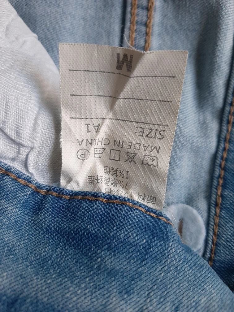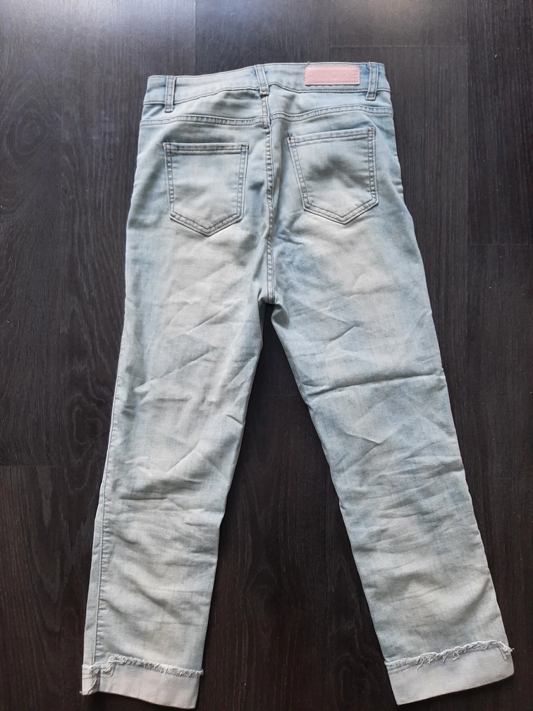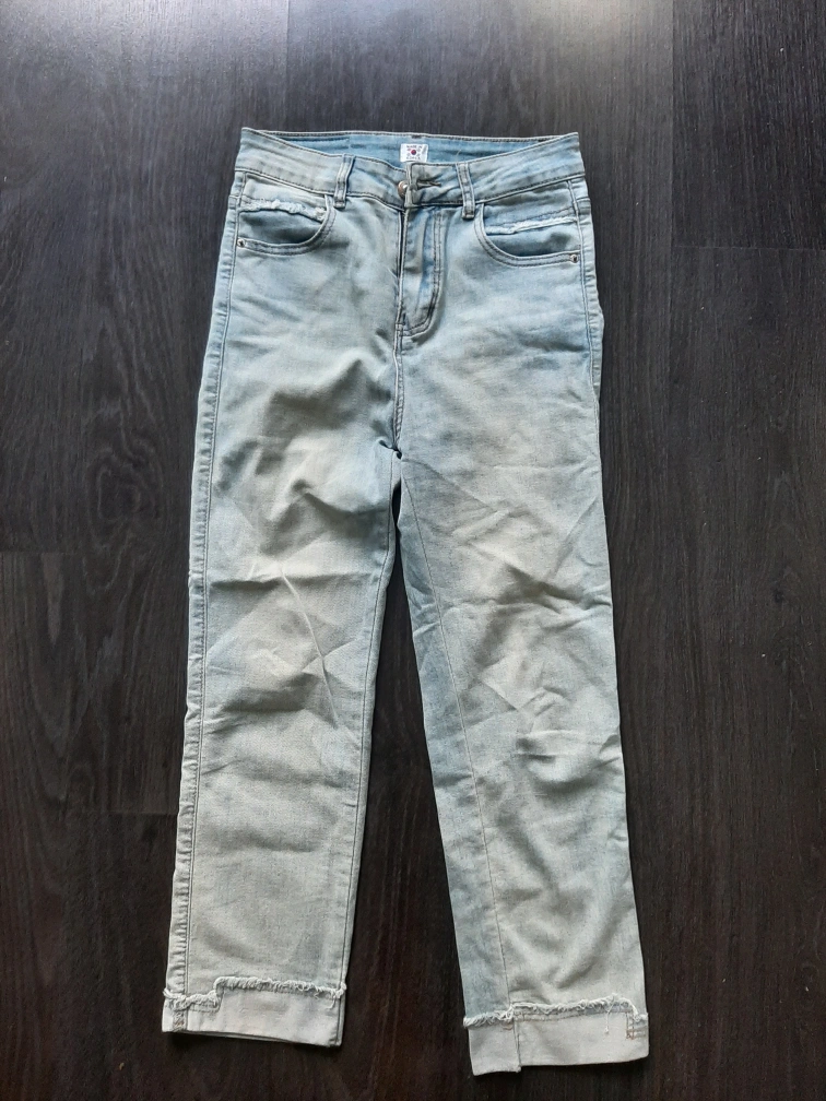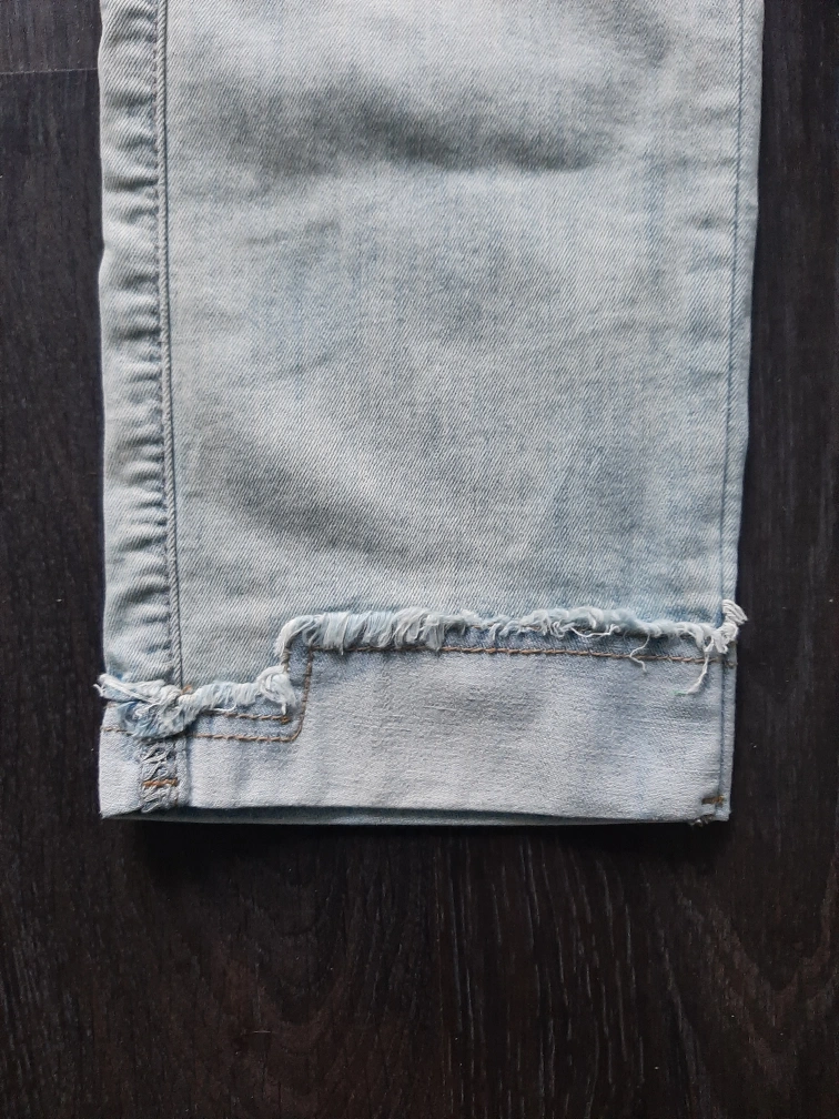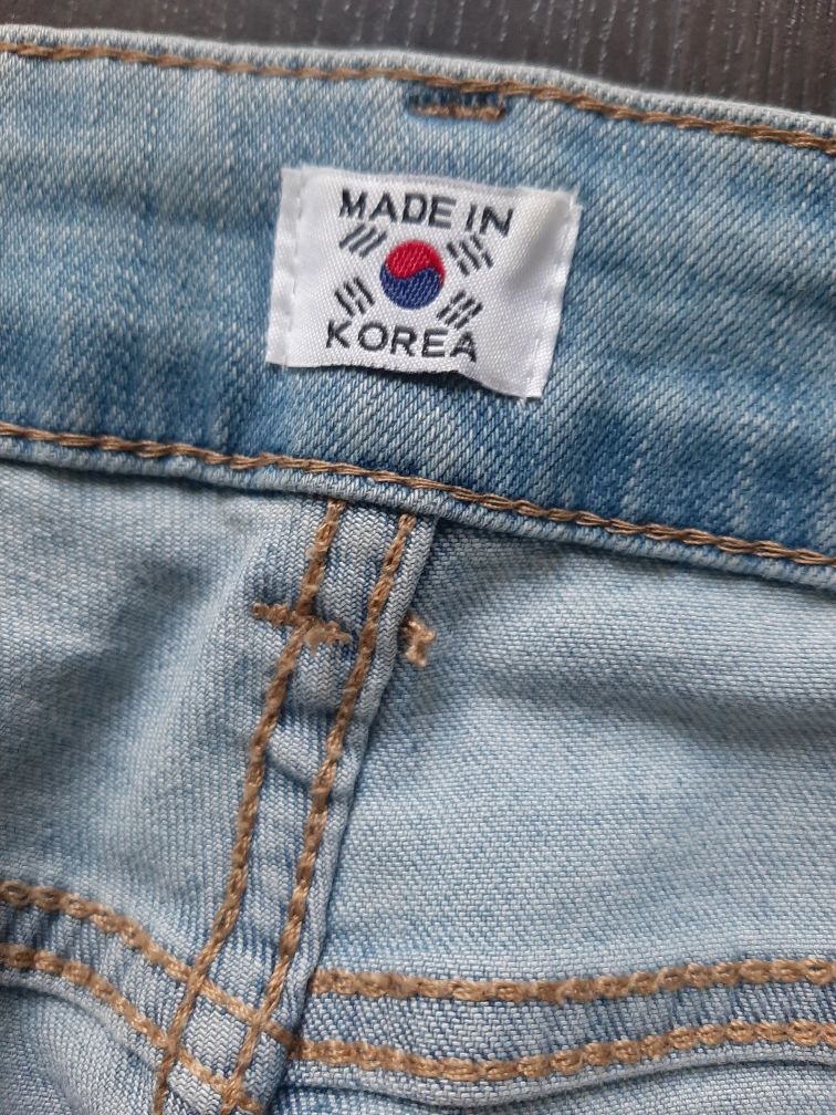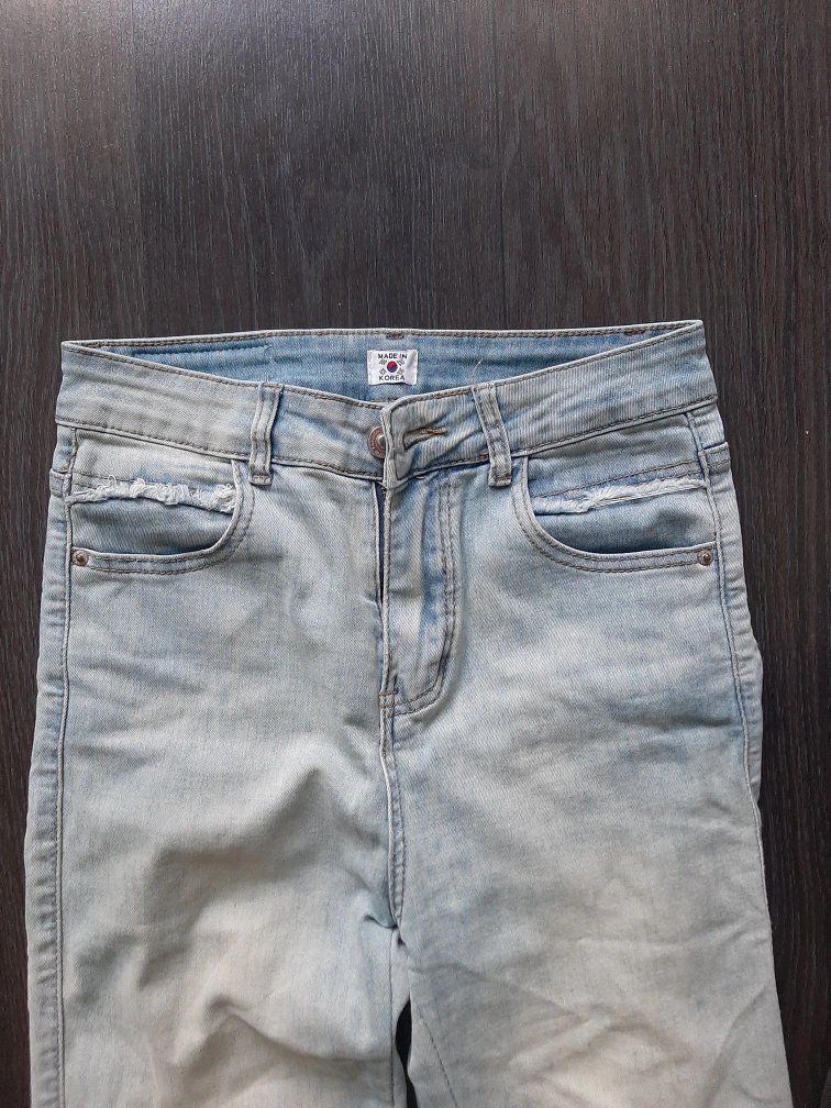 Here are some light blue denim jeans! They are in good condition and made in Korea. The jeans have a unique frayed hem.