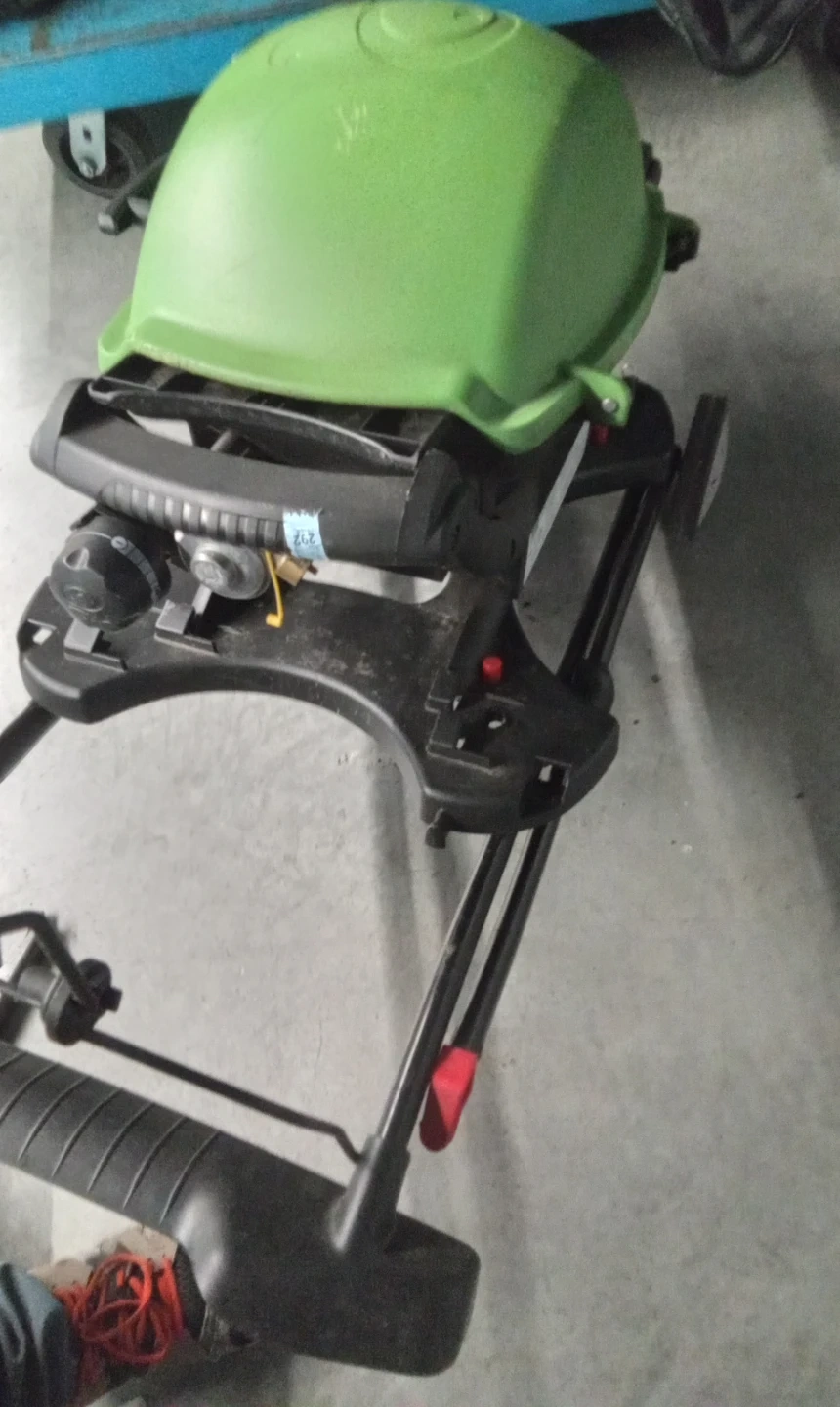 Green Weber Q1200 portable propane grill. It's designed for easy setup and use. This grill is great for camping trips or small patios!